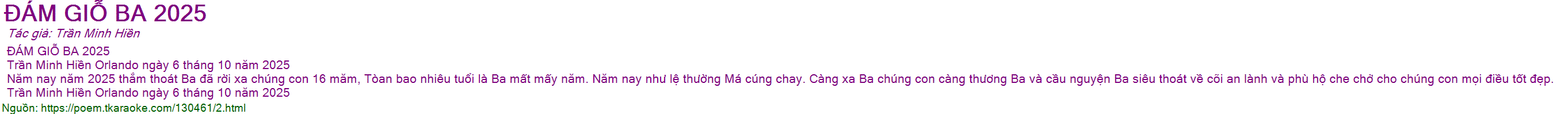 Năm nay năm 2025 thắm thoát Ba đã rời xa chúng con 16 măm, Tòan bao nhiêu tuổi là Ba mất mấy năm. Năm nay như lệ thường Má cúng chay. Càng xa Ba chúng con càng thương Ba và cầu nguyện Ba siêu thoát về cõi an lành và phù hộ che chở cho chúng con mọi điều tốt đẹp.