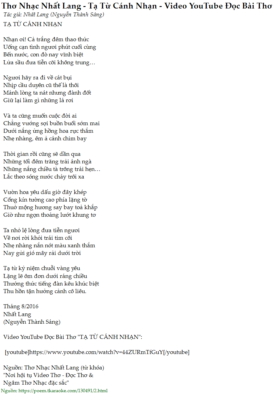 tho nhac nhat lang - ta tu canh nhan - video youtube doc bai tho