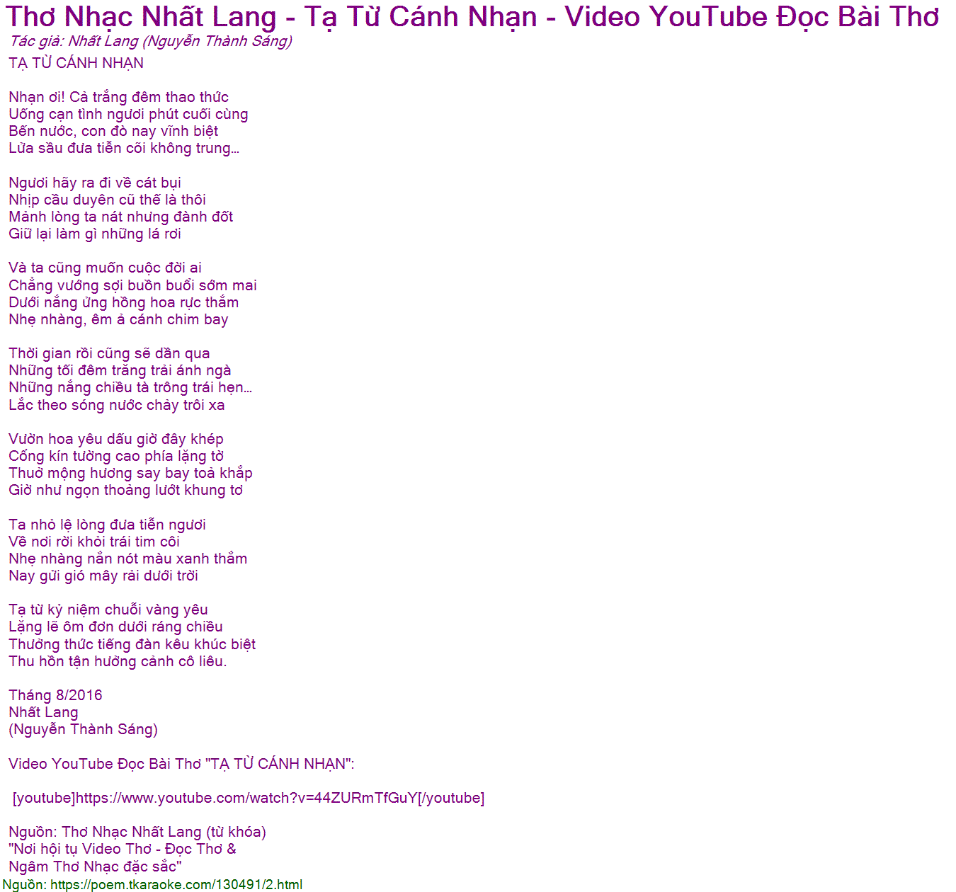 Video YouTube Doc Bai Tho "TA TU CANH NHAN":