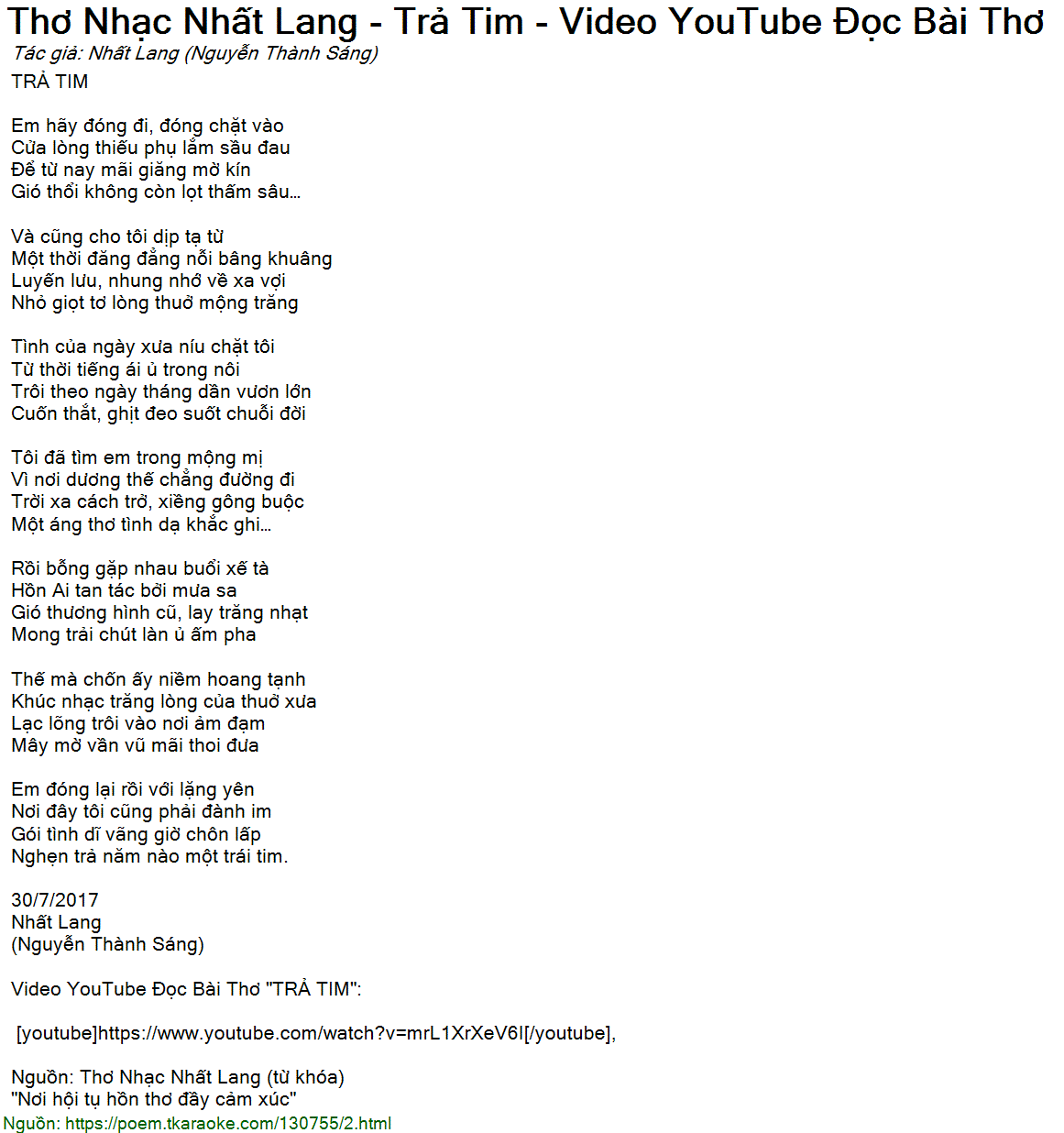 thơ nhạc nhất lang - trả tim - video youtube đọc bài thơ