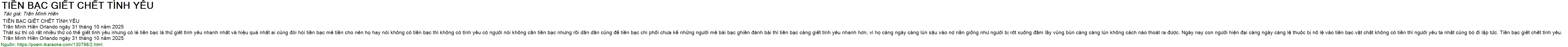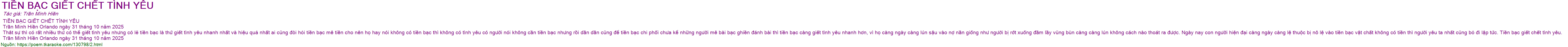 Thât sự thì có rất nhiều thứ có thể giết tình yêu nhưng có lẽ tiền bạc là thứ giết tình yêu nhanh nhất và hiệu quả nhất ai cũng đòi hỏi tiền bạc mê tiền cho nên họ hay nói không có tiền bạc thì không có tình yêu có người nói không cần tiền bạc nhưng rồi dần dần cũng để tiền bạc chi phối chưa kể những người mê bài bạc ghiền đánh bài thì tiền bạc càng giết tình yêu nhanh hơn, vì họ càng ngày càng lún sậu vào nợ nần giống như người bị rớt xuống đầm lầy vũng bùn càng càng lún không cách nào thoát ra được. Ngày nay con người hiện đại càng ngày càng lệ thuộc bị nô lệ vào tiền bạc vật chất không có tiền thì người yêu ta nhất cũng bỏ đi lập tức. Tiền bạc giết chết tình yêu.
