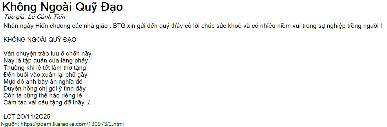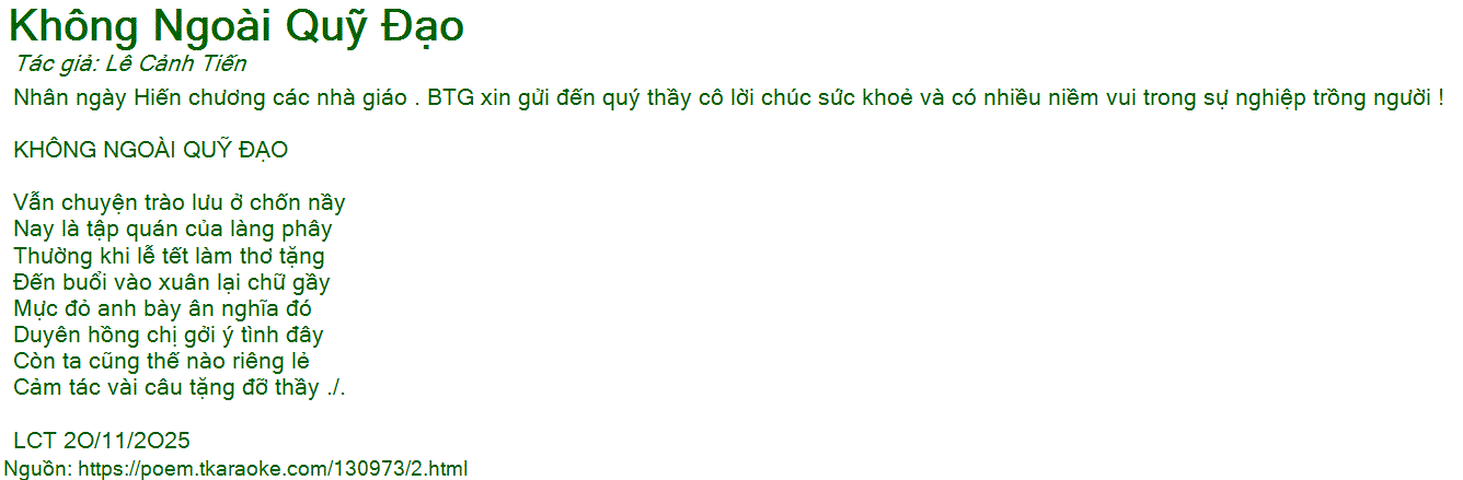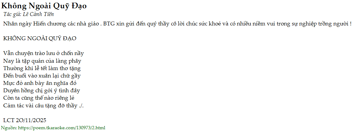 Nhân ngày Hiến chương các nhà giáo . BTG xin gửi đến quý thầy cô lời chúc sức khoẻ và có nhiều niềm vui trong sự nghiệp trồng người !