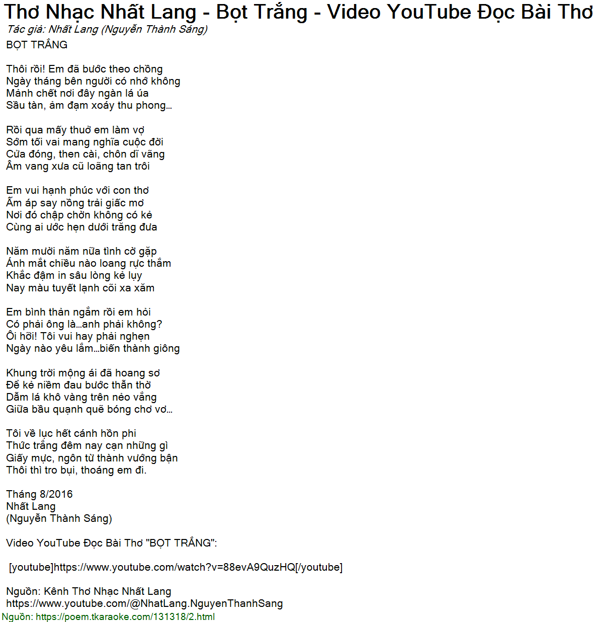 Video YouTube Đọc Bài Thơ "BỌT TRẮNG":