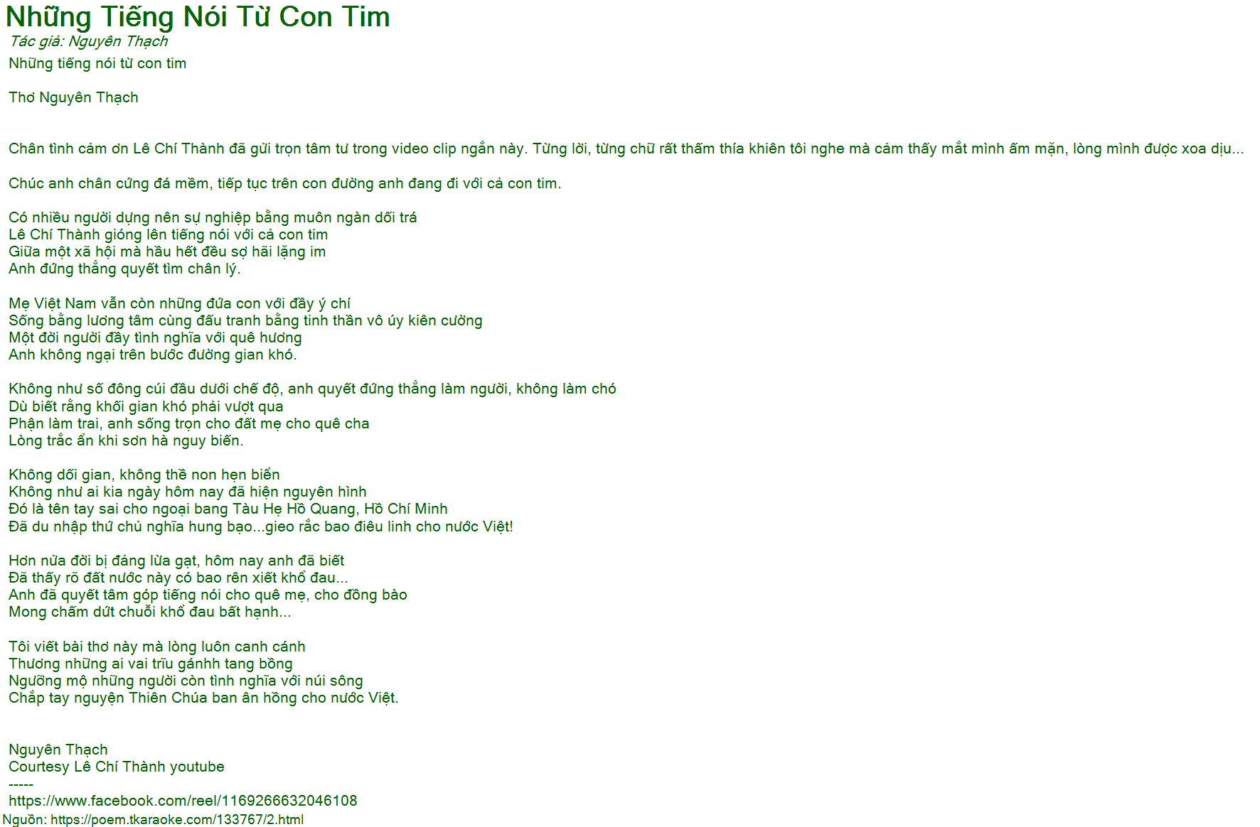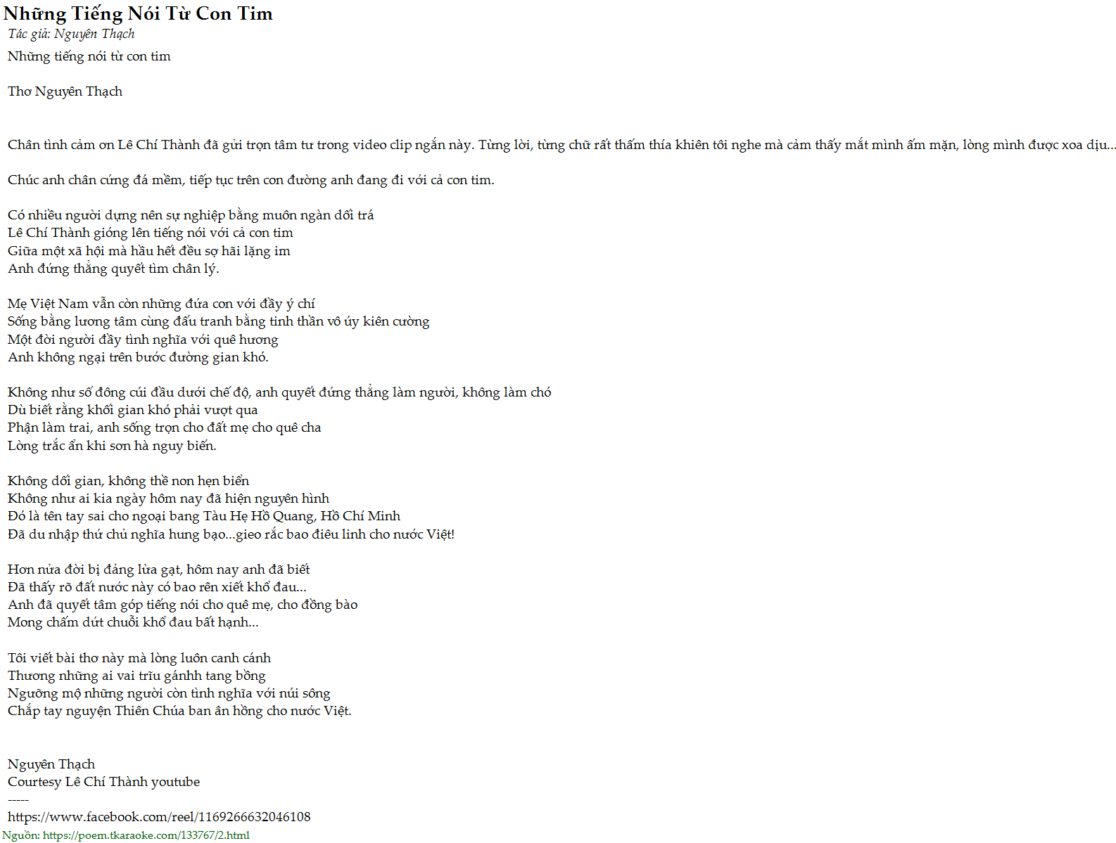 Chân tình cảm ơn Lê Chí Thành đã gửi trọn tâm tư trong video clip ngắn này. Từng lời, từng chữ rất thấm thía khiên tôi nghe mà cảm thấy mắt mình ấm mặn, lòng mình được xoa dịu...