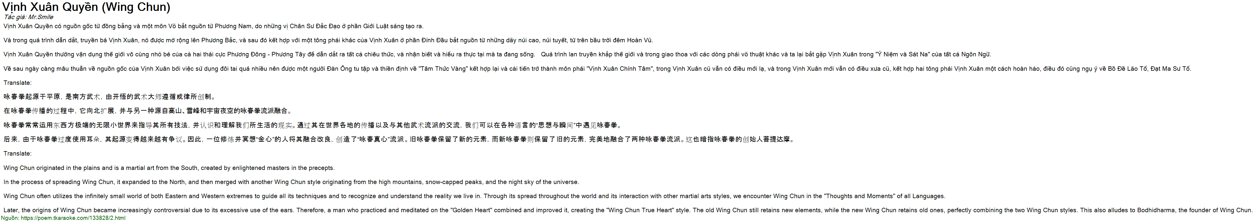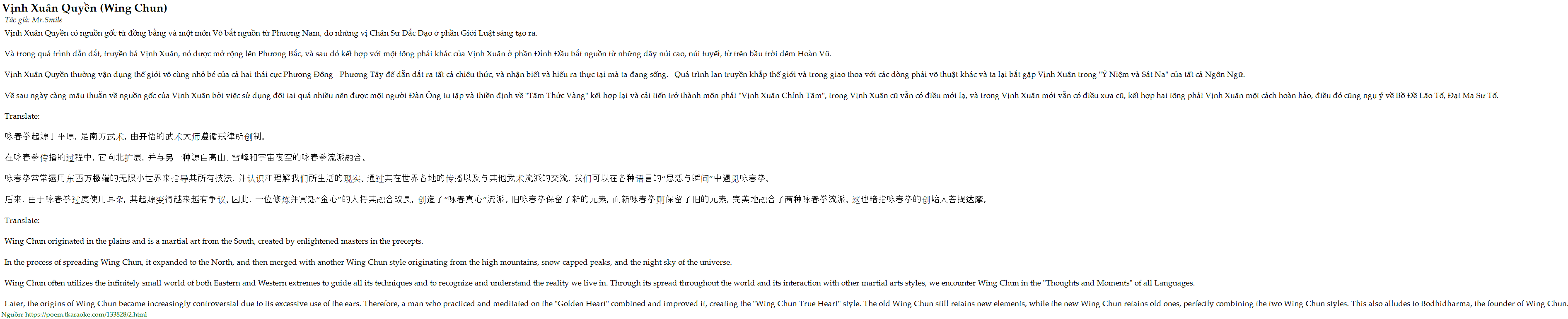 Wing Chun often utilizes the infinitely small world of both Eastern and Western extremes to guide all its techniques and to recognize and understand the reality we live in. Through its spread throughout the world and its interaction with other martial arts styles, we encounter Wing Chun in the "Thoughts and Moments" of all Languages.