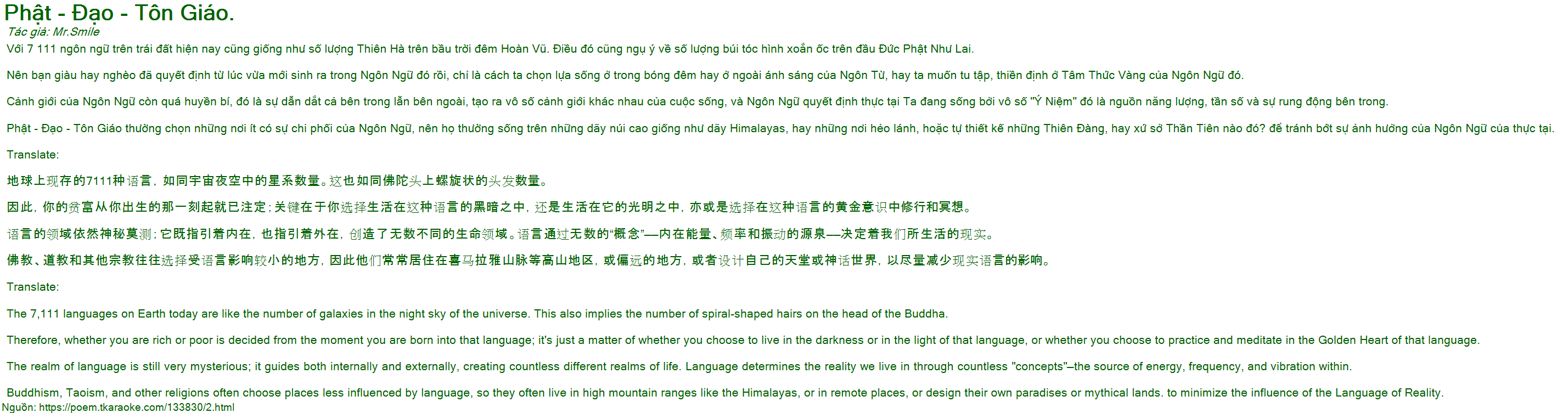 Buddhism, Taoism, and other religions often choose places less influenced by language, so they often live in high mountain ranges like the Himalayas, or in remote places, or design their own paradises or mythical lands. to minimize the influence of the Language of Reality.
