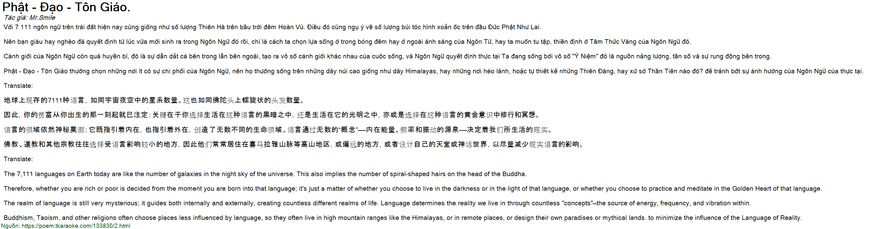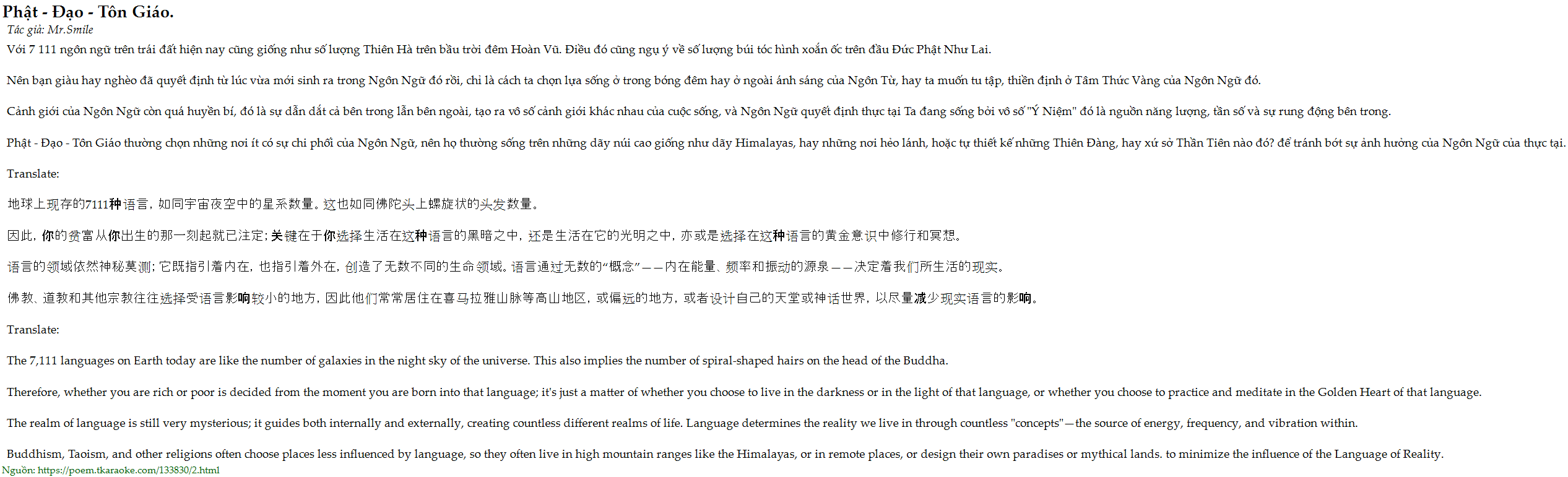 Phat - Dao - Ton Giao thuong chon nhung noi it co su chi phoi cua Ngon Ngu, nen ho thuong song tren nhung day nui cao giong nhu day Himalayas, hay nhung noi heo lanh, hoac tu thiet ke nhung Thien Dang, hay xu so Than Tien nao do? de tranh bot su anh huong cua Ngon Ngu cua thuc tai.