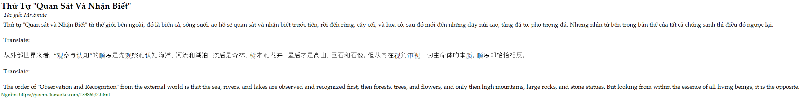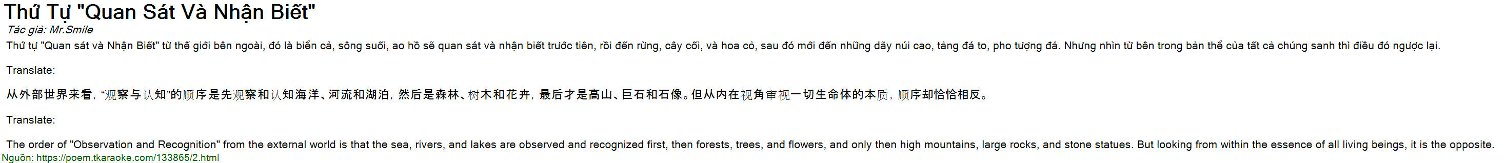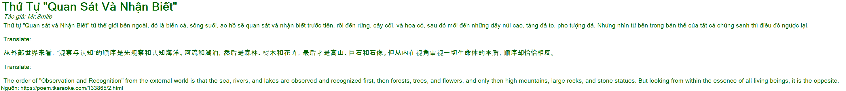 Thu tu "Quan sat va Nhan Biet" tu the gioi ben ngoai, do la bien ca, song suoi, ao ho se quan sat va nhan biet truoc tien, roi den rung, cay coi, va hoa co, sau do moi den nhung day nui cao, tang da to, pho tuong da. Nhung nhin tu ben trong ban the cua tat ca chung sanh thi dieu do nguoc lai.