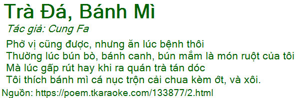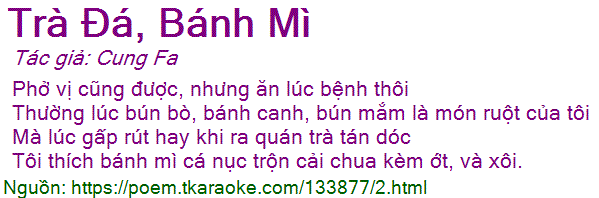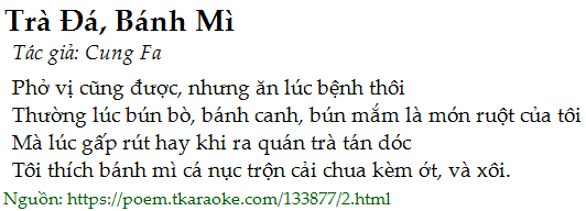 Toi thich banh mi ca nuc tron cai chua kem ot, va xoi.