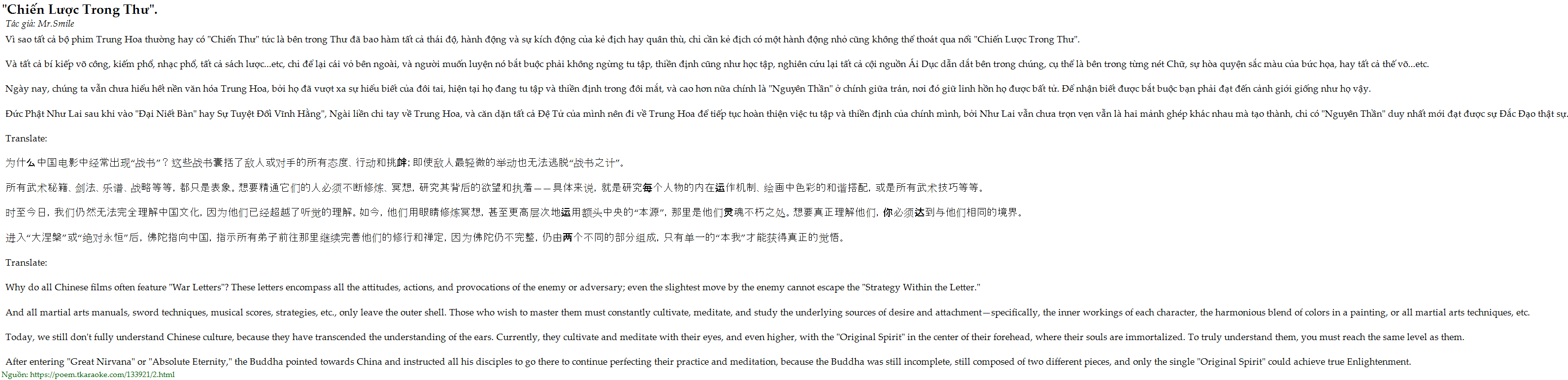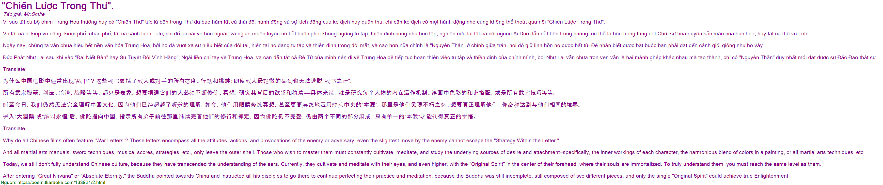 Ngày nay, chúng ta vẫn chưa hiểu hết nền văn hóa Trung Hoa, bởi họ đã vượt xa sự hiểu biết của đôi tai, hiện tại họ đang tu tập và thiền định trong đôi mắt, và cao hơn nữa chính là "Nguyên Thần" ở chính giữa trán, nơi đó giữ linh hồn họ được bất tử. Để nhận biết được bắt buộc bạn phải đạt đến cảnh giới giống như họ vậy.