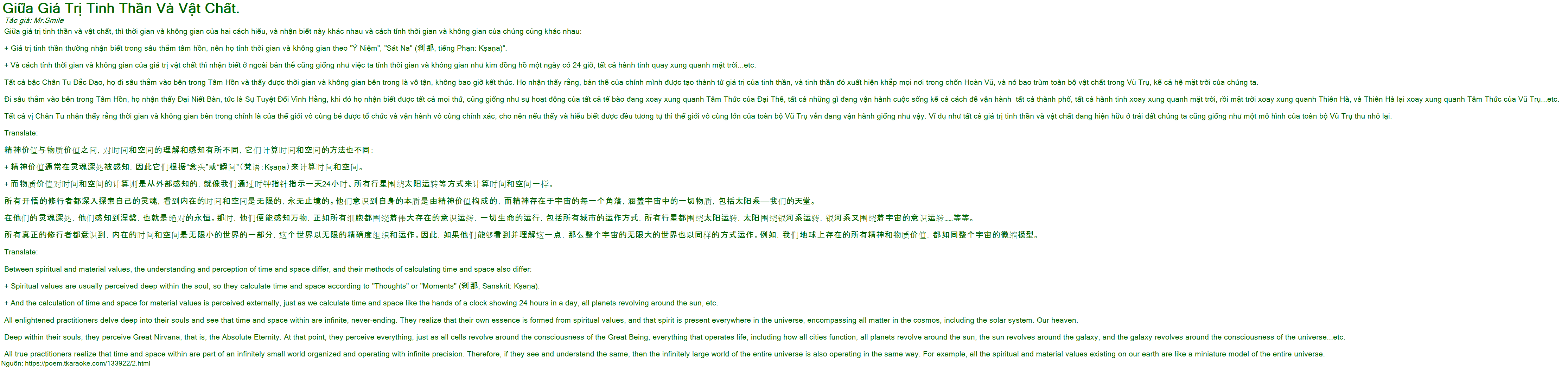 + Giá trị tinh thần thường nhận biết trong sâu thẳm tâm hồn, nên họ tính thời gian và không gian theo "Ý Niệm", "Sát Na" (刹那, tiếng Phạn: Kṣaṇa)".