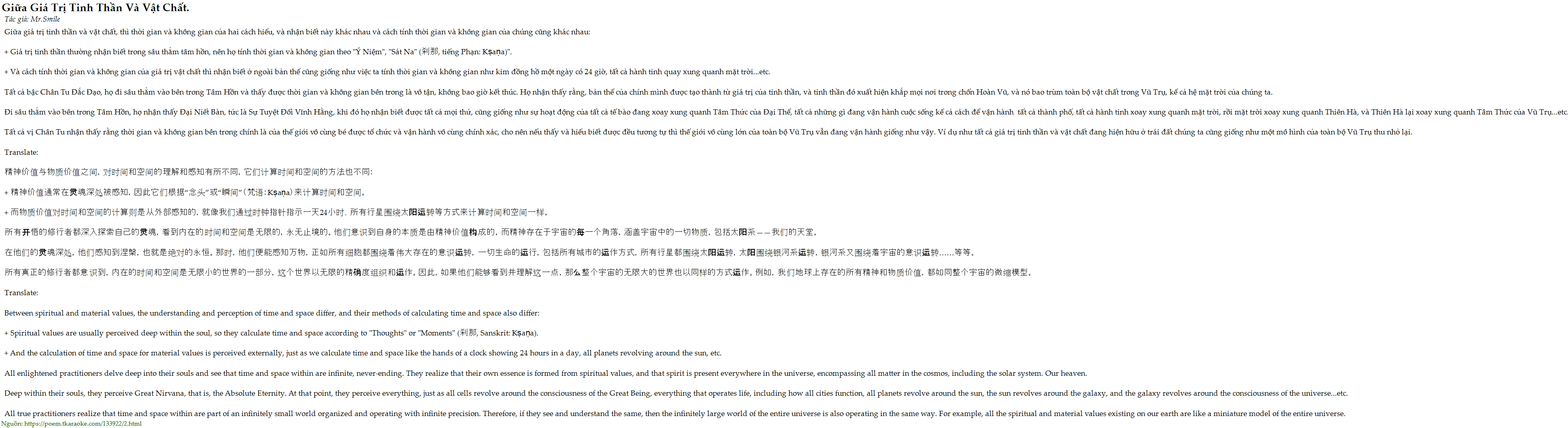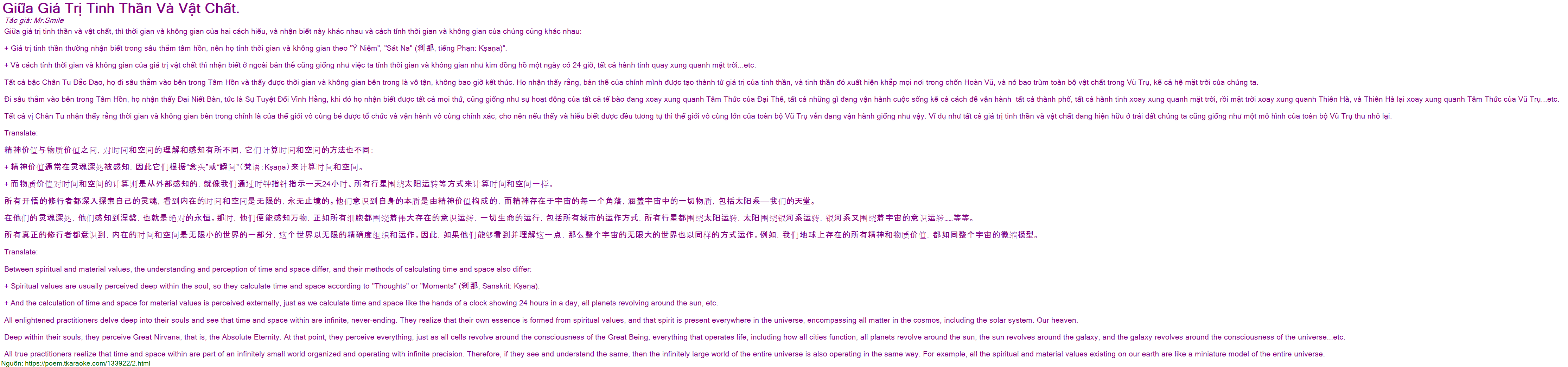 Tất cả bậc Chân Tu Đắc Đạo, họ đi sâu thẳm vào bên trong Tâm Hồn và thấy được thời gian và không gian bên trong là vô tận, không bao giờ kết thúc. Họ nhận thấy rằng, bản thể của chính mình được tạo thành từ giá trị của tinh thần, và tinh thần đó xuất hiện khắp mọi nơi trong chốn Hoàn Vũ, và nó bao trùm toàn bộ vật chất trong Vũ Trụ, kể cả hệ mặt trời của chúng ta.