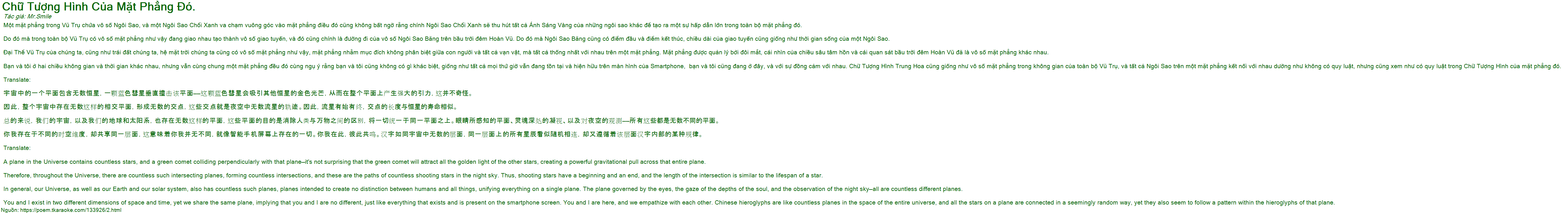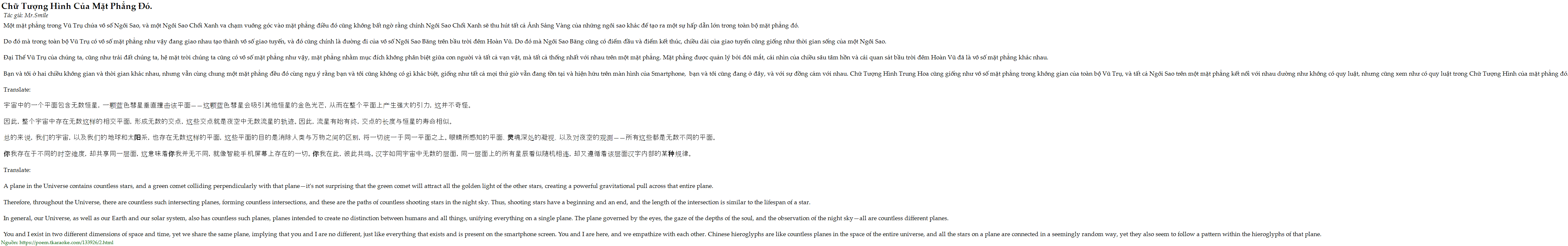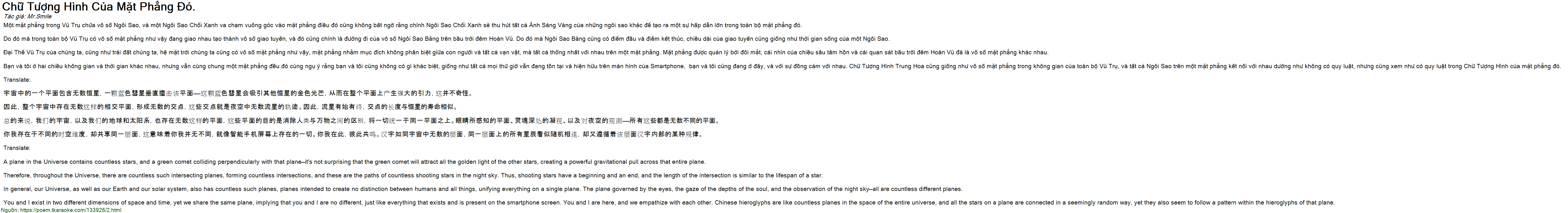 Bạn và tôi ở hai chiều không gian và thời gian khác nhau, nhưng vẫn cùng chung một mặt phẳng đều đó cùng ngụ ý rằng bạn và tôi cũng không có gì khác biệt, giống như tất cả mọi thứ giờ vẫn đang tồn tại và hiện hữu trên màn hình của Smartphone, bạn và tôi cũng đang ở đây, và với sự đồng cảm với nhau. Chữ Tượng Hình Trung Hoa cũng giống như vô số mặt phẳng trong không gian của toàn bộ Vũ Trụ, và tất cả Ngôi Sao trên một mặt phẳng kết nối với nhau dường như không có quy luật, nhưng cũng xem như có quy luật trong Chữ Tượng Hình của mặt phẳng đó.