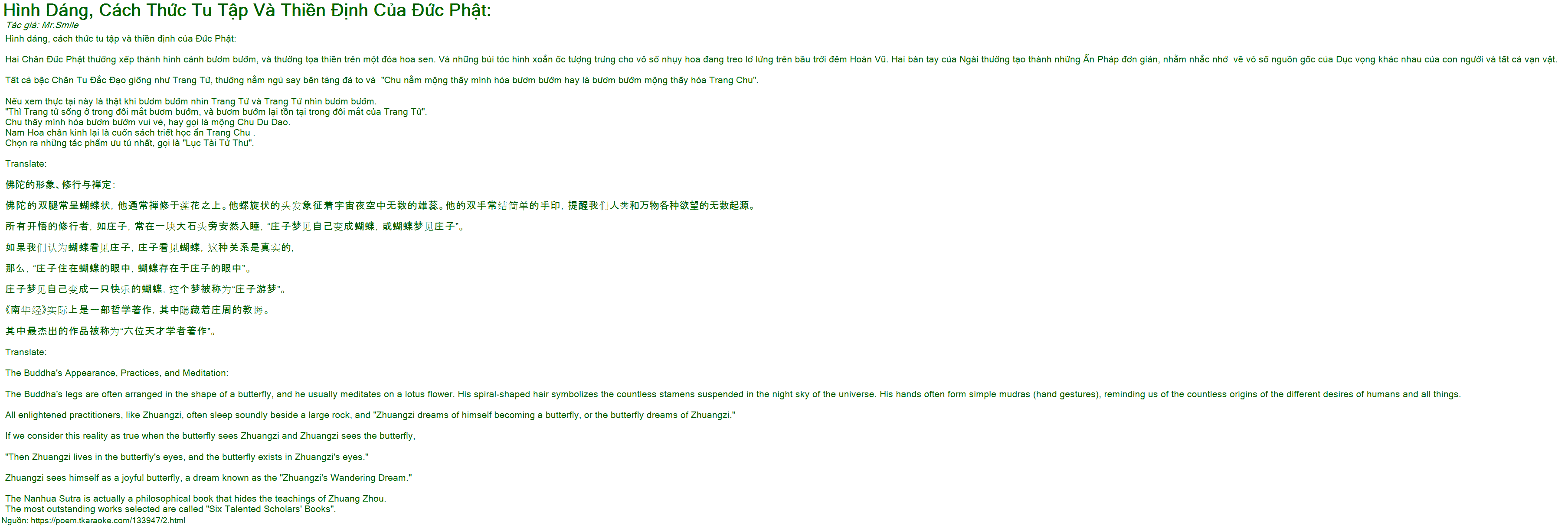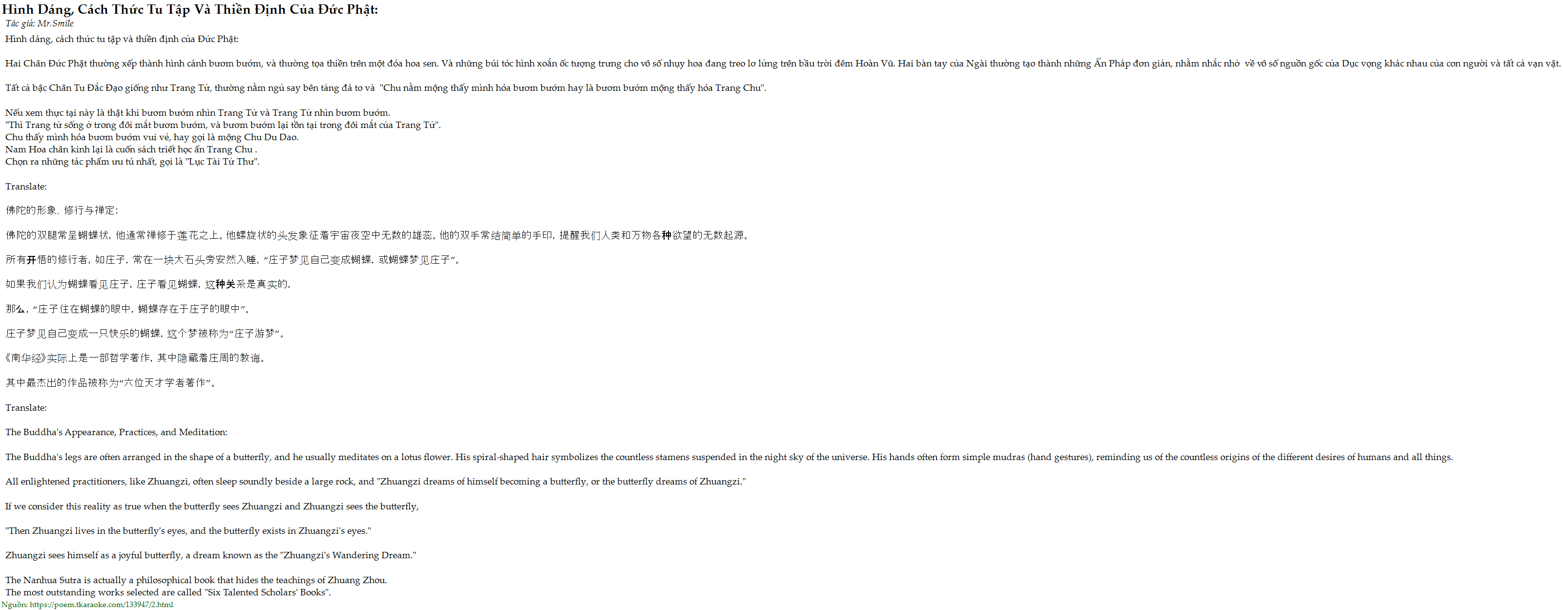 Tất cả bậc Chân Tu Đắc Đạo giống như Trang Tử, thường nằm ngủ say bên tảng đá to và "Chu nằm mộng thấy mình hóa bươm bướm hay là bươm bướm mộng thấy hóa Trang Chu".