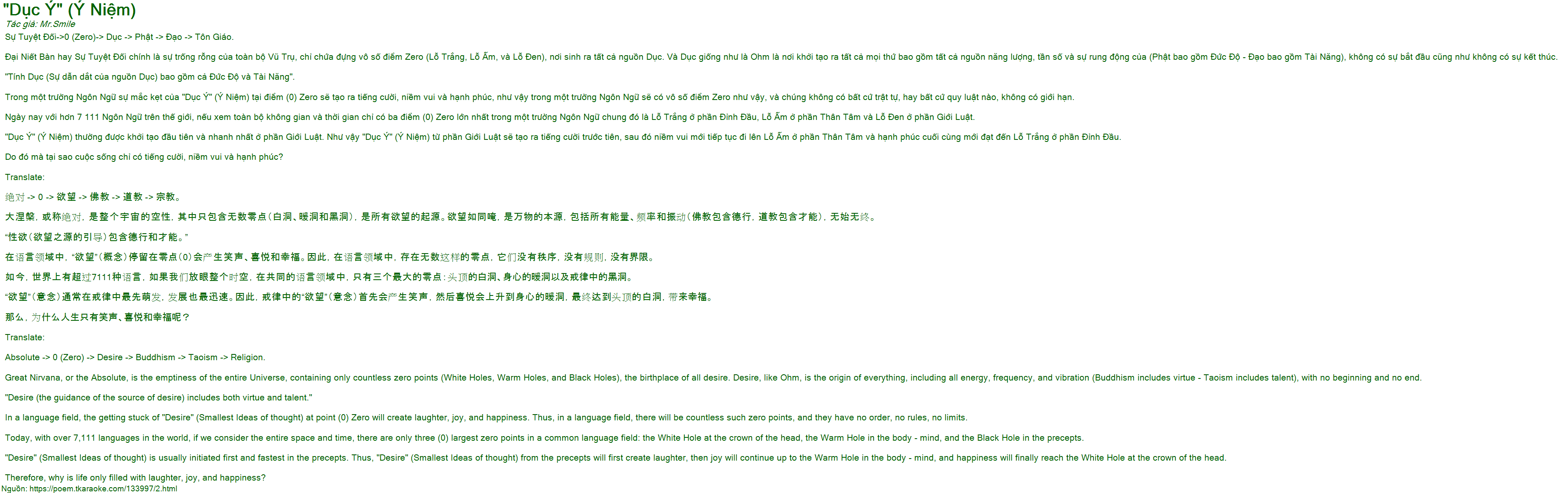 Trong một trường Ngôn Ngữ sự mắc kẹt của "Dục Ý" (Ý Niệm) tại điểm (0) Zero sẽ tạo ra tiếng cười, niềm vui và hạnh phúc, như vậy trong một trường Ngôn Ngữ sẽ có vô số điểm Zero như vậy, và chúng không có bất cứ trật tự, hay bất cứ quy luật nào, không có giới hạn.
