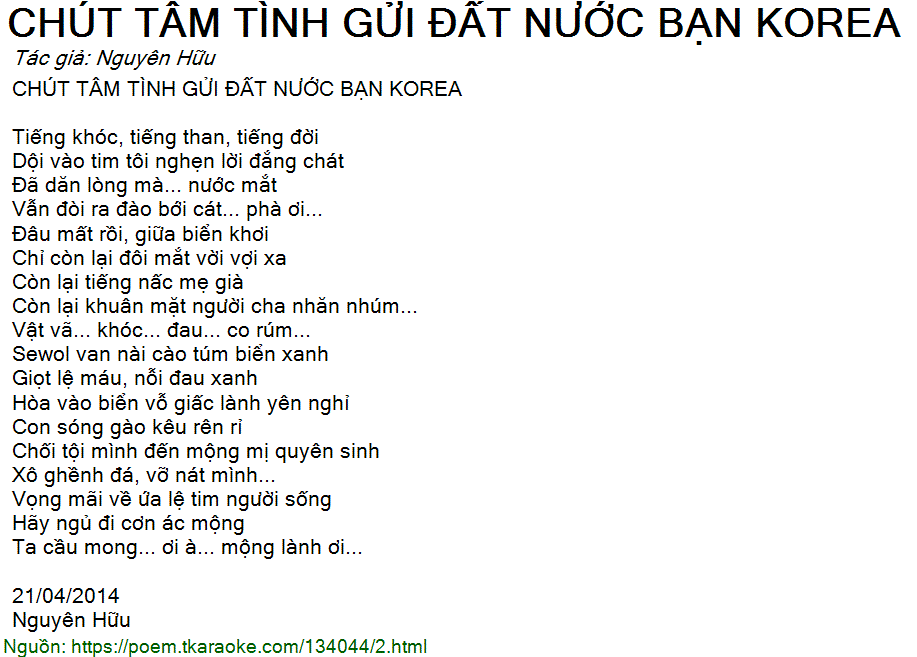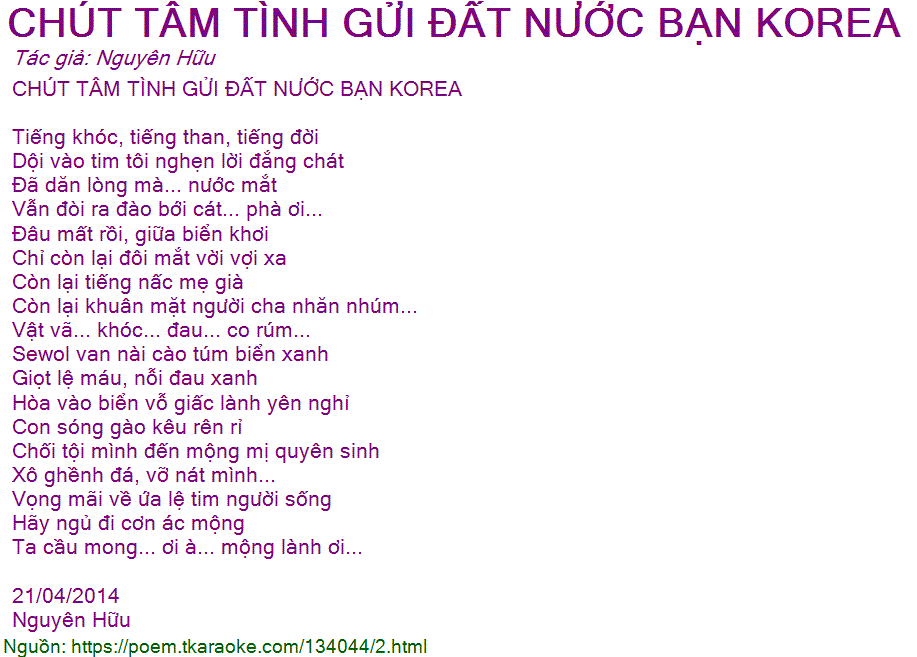 CHÚT TÂM TÌNH GỬI ĐẤT NƯỚC BẠN KOREA