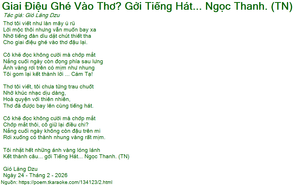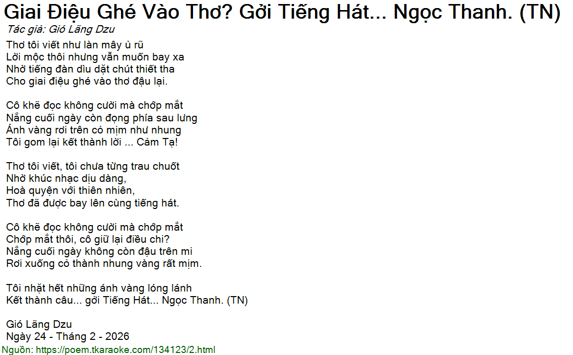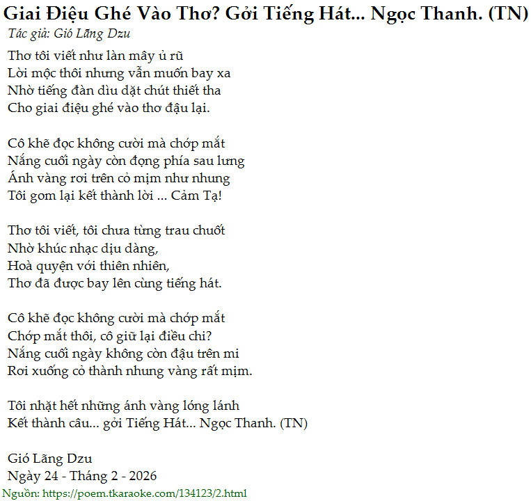 giai điệu ghé vào thơ? gởi tiếng hát... ngọc thanh. (tn)