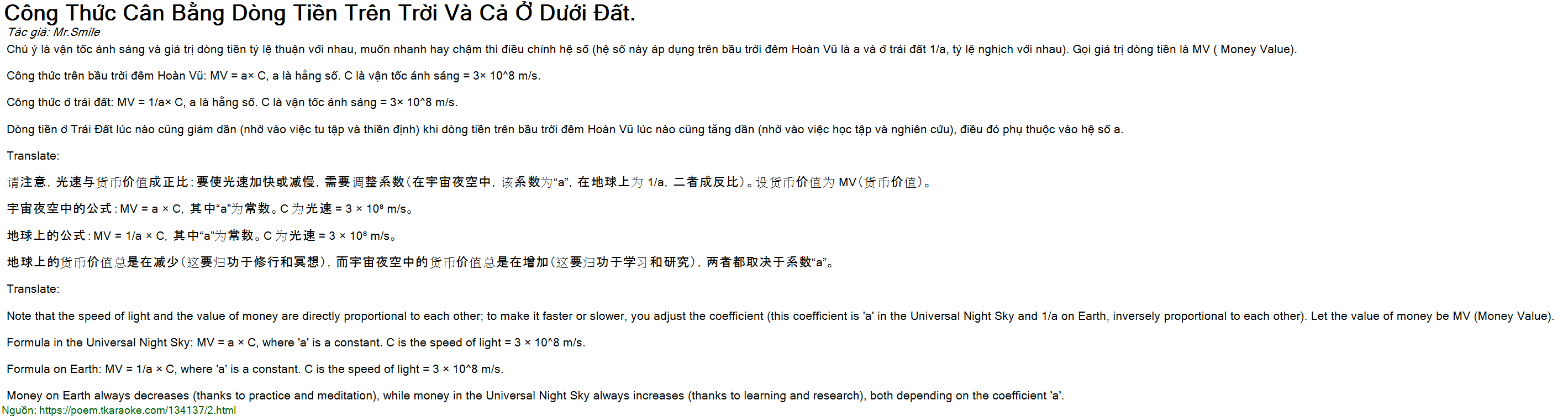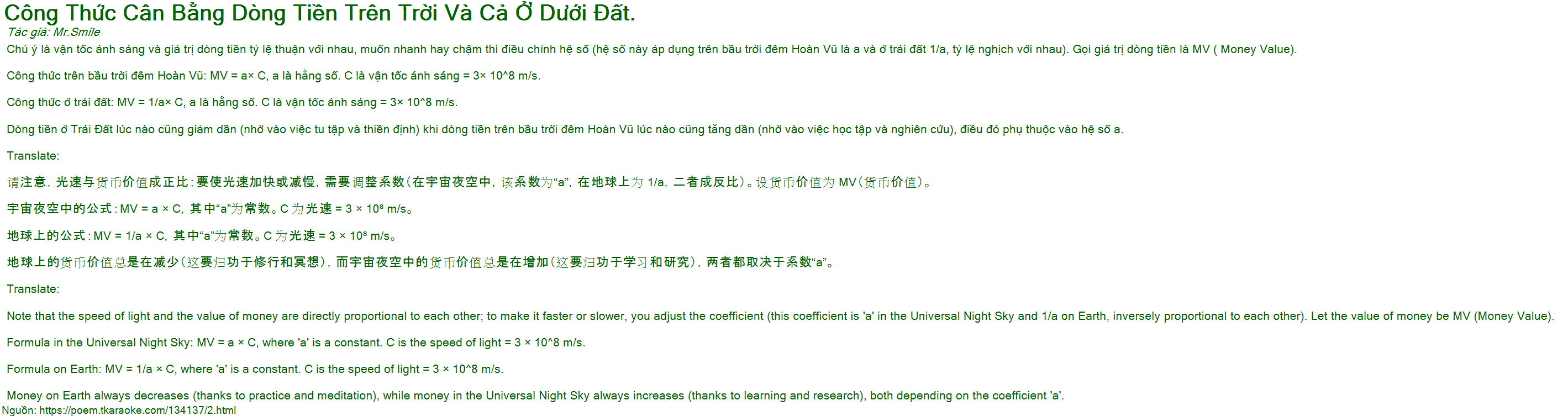 Chú ý là vận tốc ánh sáng và giá trị dòng tiền tỷ lệ thuận với nhau, muốn nhanh hay chậm thì điều chỉnh hệ số (hệ số này áp dụng trên bầu trời đêm Hoàn Vũ là a và ở trái đất 1/a, tỷ lệ nghịch với nhau). Gọi giá trị dòng tiền là MV ( Money Value).