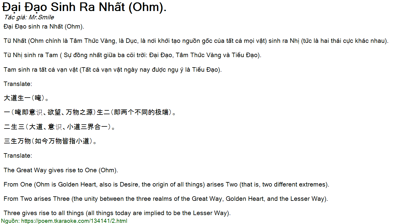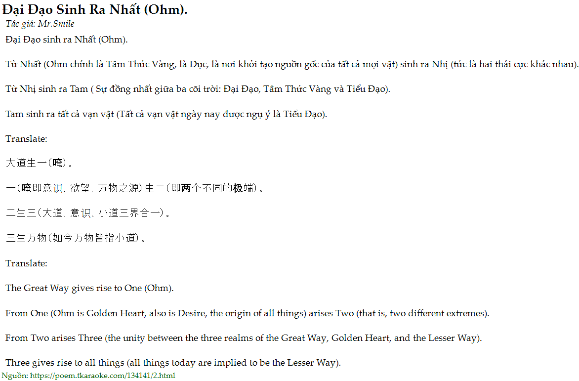 Từ Nhất (Ohm chính là Tâm Thức Vàng, là Dục, là nơi khởi tạo nguồn gốc của tất cả mọi vật) sinh ra Nhị (tức là hai thái cực khác nhau).
