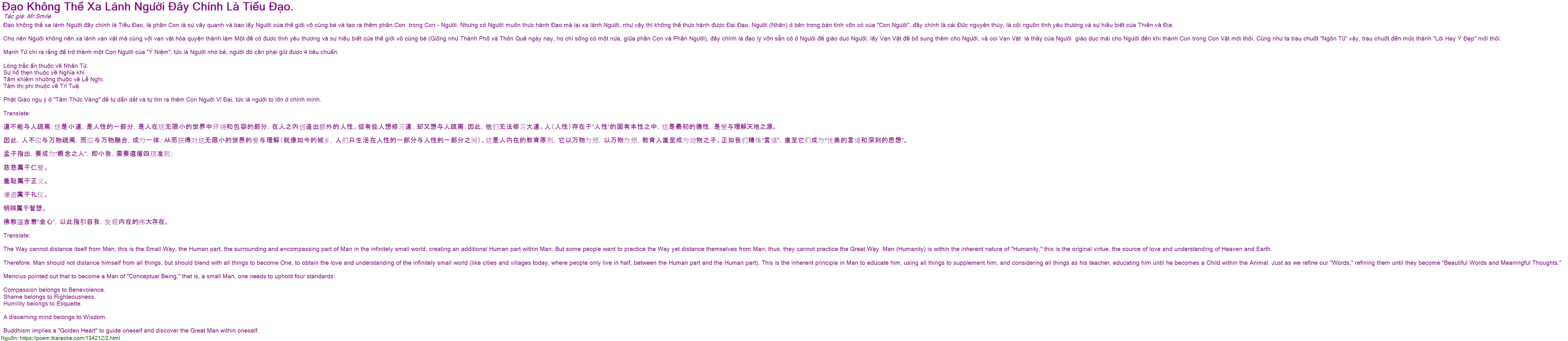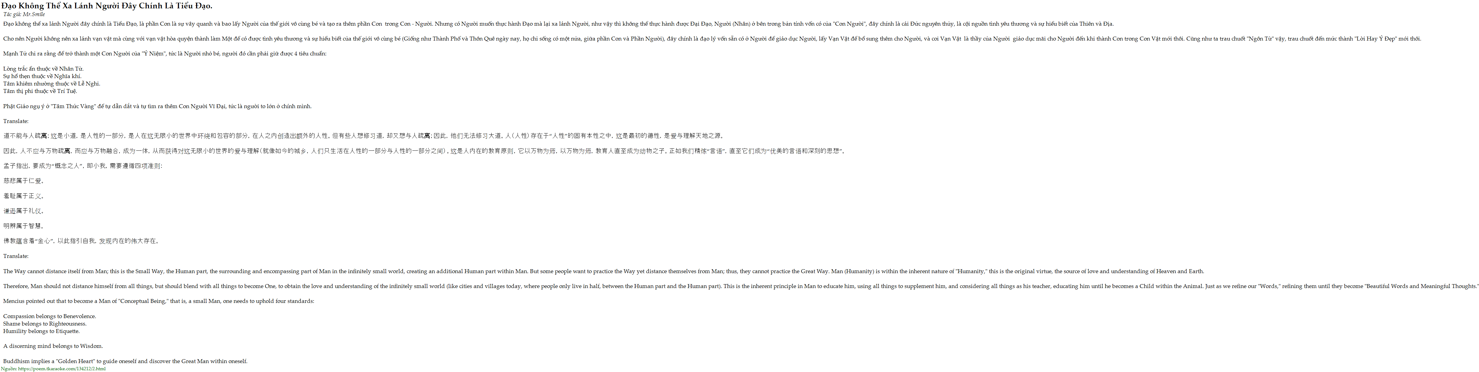 The Way cannot distance itself from Man; this is the Small Way, the Human part, the surrounding and encompassing part of Man in the infinitely small world, creating an additional Human part within Man. But some people want to practice the Way yet distance themselves from Man; thus, they cannot practice the Great Way. Man (Humanity) is within the inherent nature of "Humanity," this is the original virtue, the source of love and understanding of Heaven and Earth.