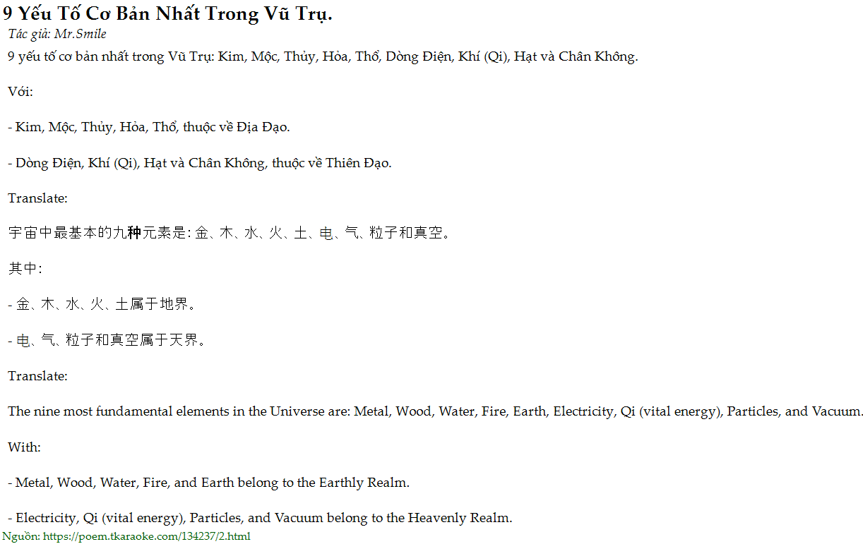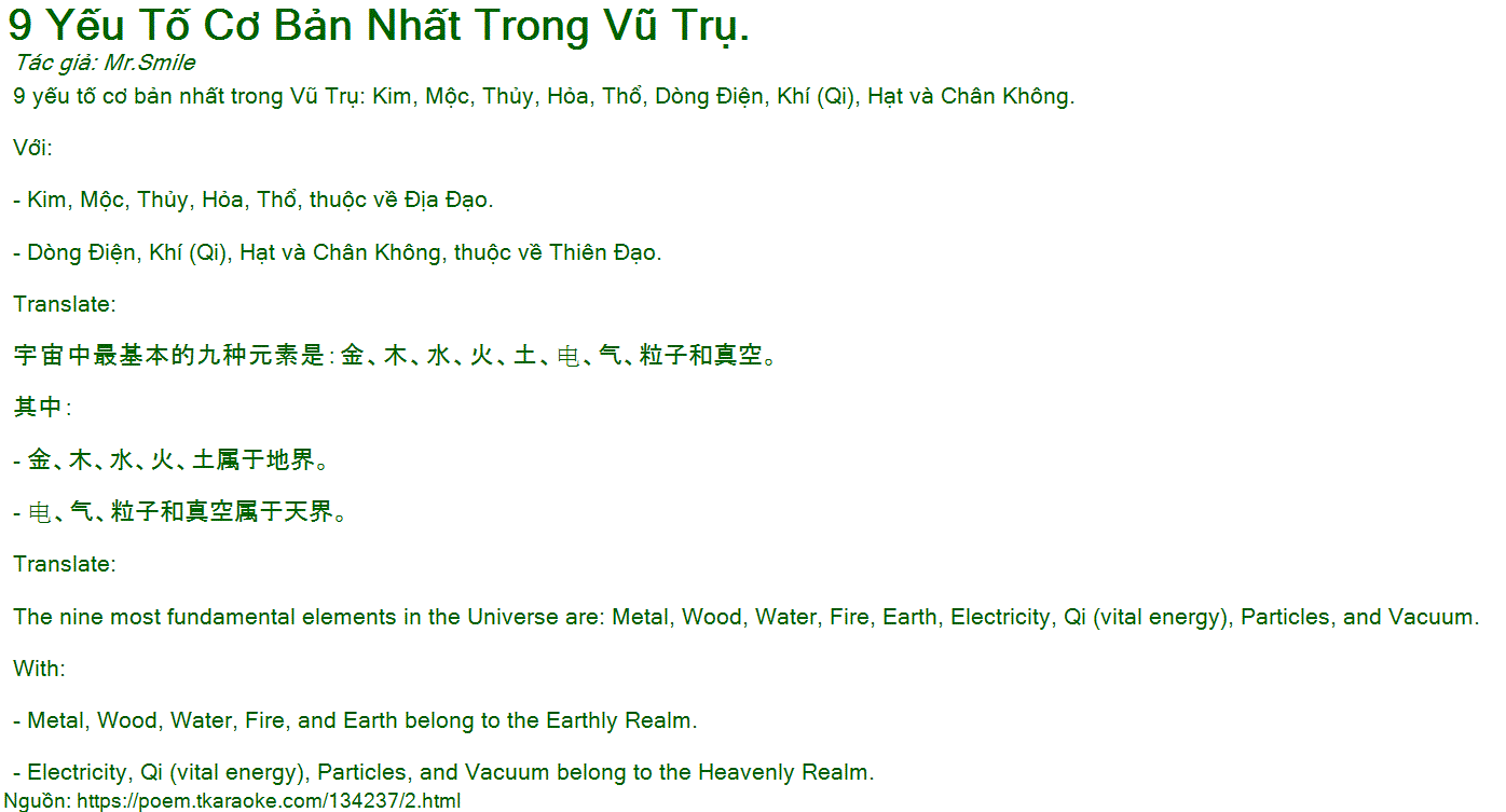 9 yếu tố cơ bản nhất trong Vũ Trụ: Kim, Mộc, Thủy, Hỏa, Thổ, Dòng Điện, Khí (Qi), Hạt và Chân Không.