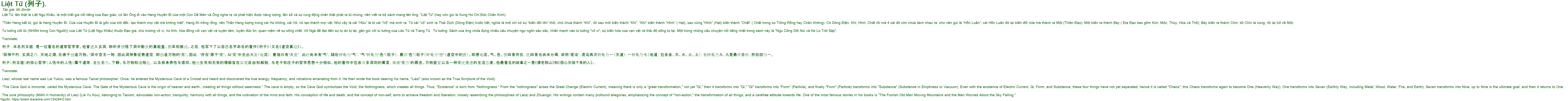 Liezi, whose real name was Lie Yukou, was a famous Taoist philosopher. Once, he entered the Mysterious Cave of a Cricket and heard and discovered the true energy, frequency, and vibrations emanating from it. He then wrote the book bearing his name, "Liezi" (also known as the True Scripture of the Void).