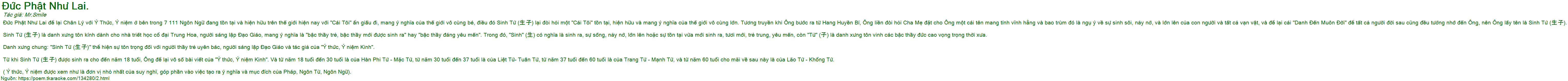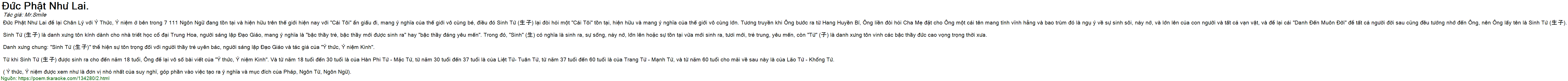 Đức Phật Như Lai để lại Chân Lý với Ý Thức, Ý niệm ở bên trong 7 111 Ngôn Ngữ đang tồn tại và hiện hữu trên thế giới hiện nay với "Cái Tôi" ẩn giấu đi, mang ý nghĩa của thế giới vô cùng bé, điều đó Sinh Tử (生子) lại đòi hỏi một "Cái Tôi" tồn tại, hiện hữu và mang ý nghĩa của thế giới vô cùng lớn. Tương truyền khi Ông bước ra từ Hang Huyền Bí, Ông liền đòi hỏi Cha Mẹ đặt cho Ông một cái tên mang tính vĩnh hằng và bao trùm đó là ngụ ý về sự sinh sôi, nảy nở, và lớn lên của con người và tất cả vạn vật, và để lại cái "Danh Đến Muôn Đời" để tất cả người đời sau cũng đều tưởng nhớ đến Ông, nên Ông lấy tên là Sinh Tử (生子).