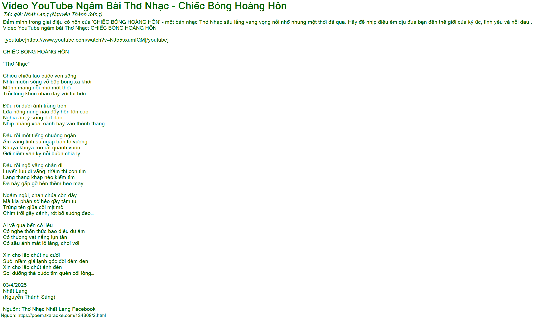 Video YouTube ngâm bài Thơ Nhạc: CHIẾC BÓNG HOÀNG HÔN