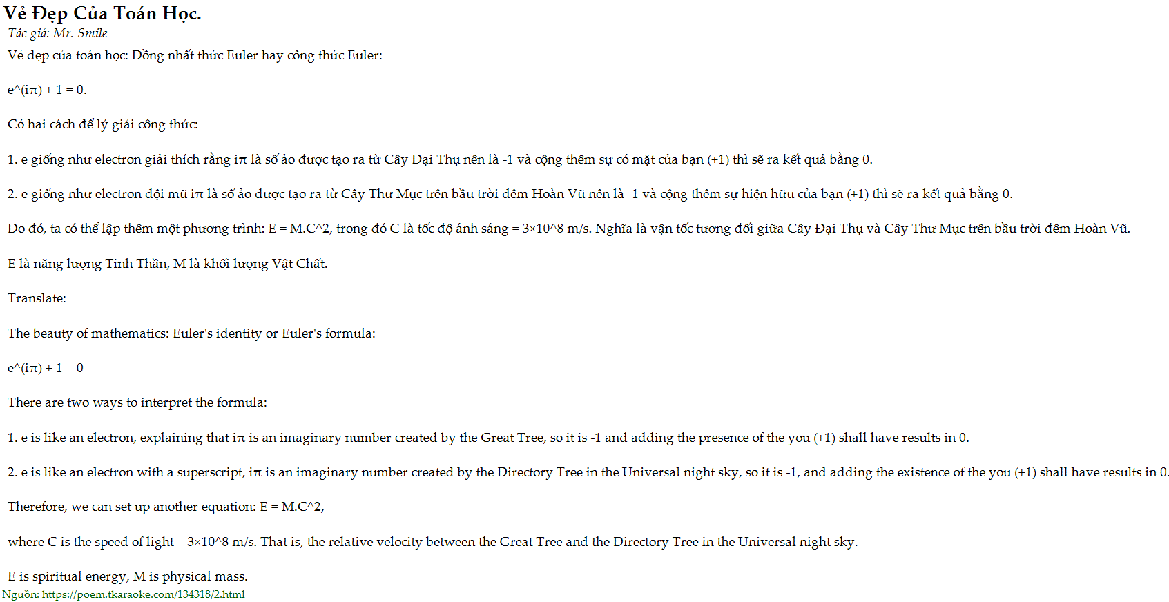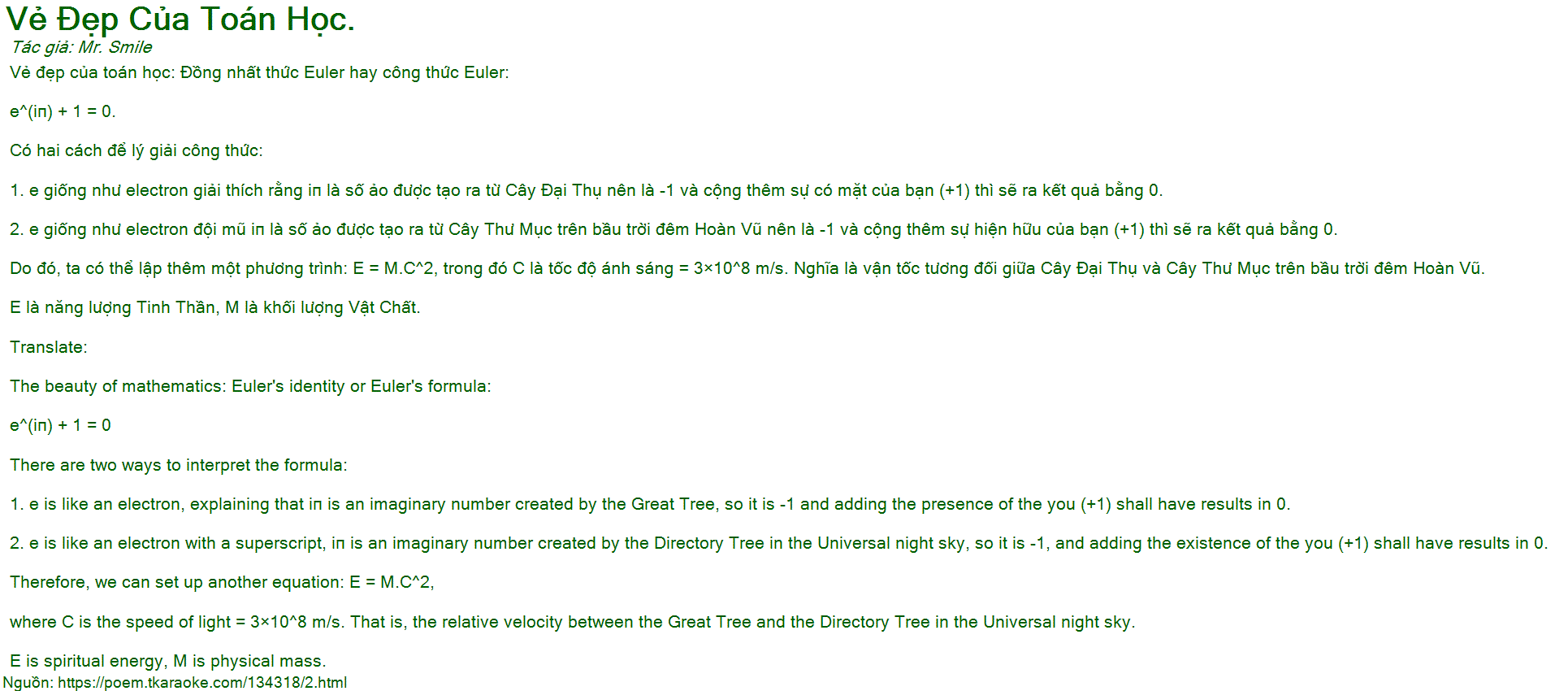 2. e giống như electron đội mũ iπ là số ảo được tạo ra từ Cây Thư Mục trên bầu trời đêm Hoàn Vũ nên là -1 và cộng thêm sự hiện hữu của bạn (+1) thì sẽ ra kết quả bằng 0.