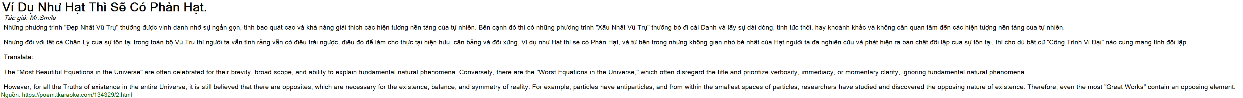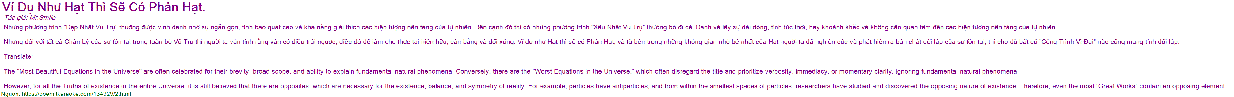 Những phương trình "Đẹp Nhất Vũ Trụ" thường được vinh danh nhờ sự ngắn gọn, tính bao quát cao và khả năng giải thích các hiện tượng nền tảng của tự nhiên. Bên cạnh đó thì có những phương trình "Xấu Nhất Vũ Trụ" thường bỏ đi cái Danh và lấy sự dài dòng, tính tức thời, hay khoảnh khắc và không cần quan tâm đến các hiện tượng nền tảng của tự nhiên.