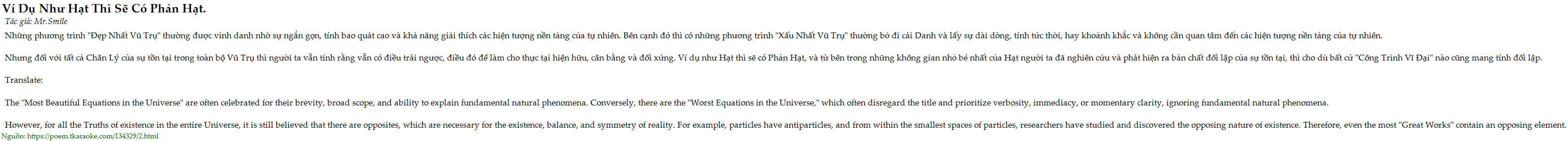 Nhưng đối với tất cả Chân Lý của sự tồn tại trong toàn bộ Vũ Trụ thì người ta vẫn tính rằng vẫn có điều trái ngược, điều đó để làm cho thực tại hiện hữu, cân bằng và đối xứng. Ví dụ như Hạt thì sẽ có Phản Hạt, và từ bên trong những không gian nhỏ bé nhất của Hạt người ta đã nghiên cứu và phát hiện ra bản chất đối lập của sự tồn tại, thì cho dù bất cứ "Công Trình Vĩ Đại" nào cũng mang tính đối lập.