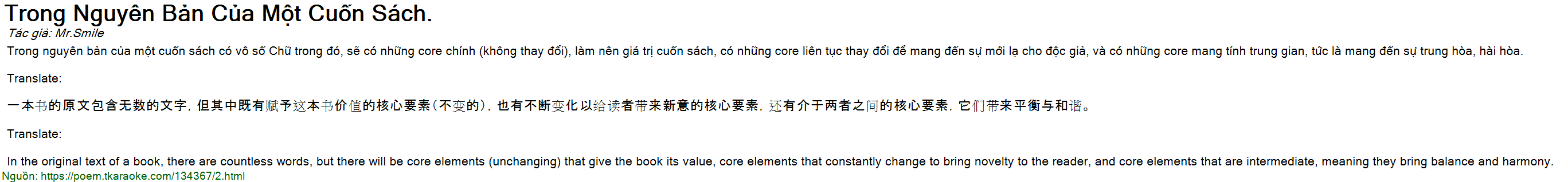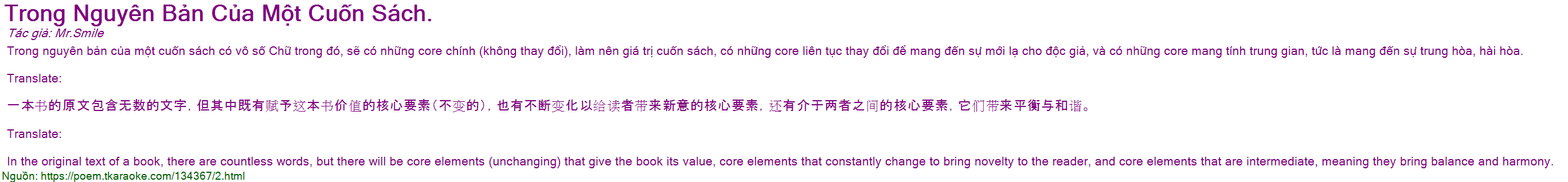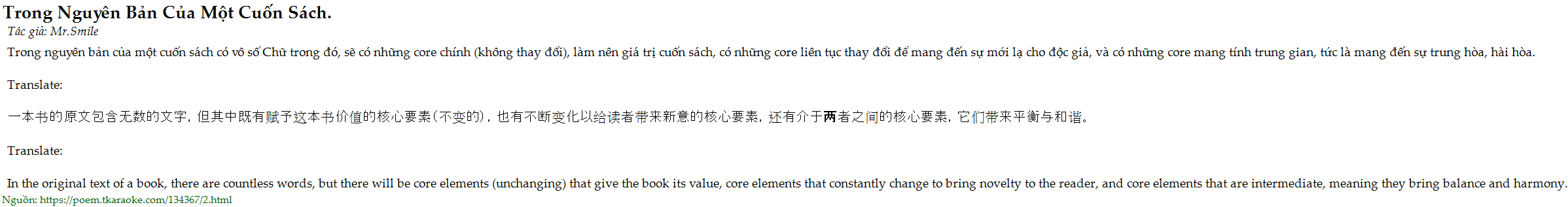 Trong nguyên bản của một cuốn sách có vô số Chữ trong đó, sẽ có những core chính (không thay đổi), làm nên giá trị cuốn sách, có những core liên tục thay đổi để mang đến sự mới lạ cho độc giả, và có những core mang tính trung gian, tức là mang đến sự trung hòa, hài hòa.