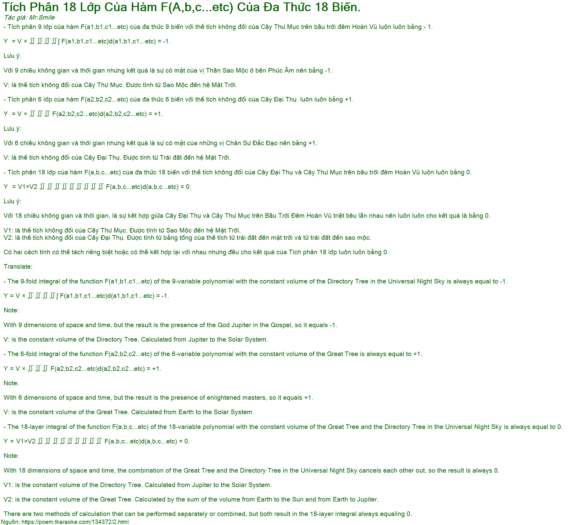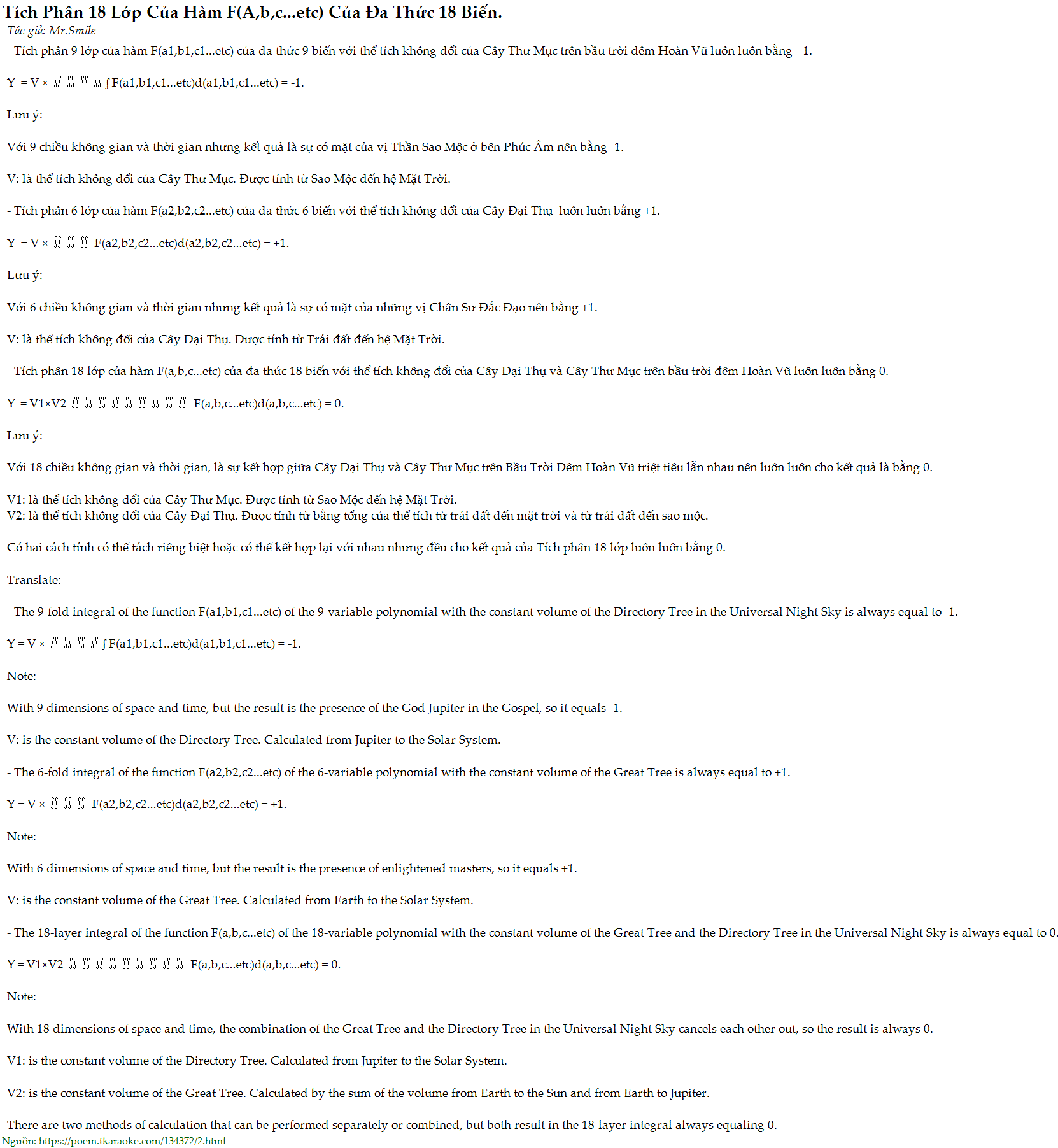 - Tích phân 18 lớp của hàm F(a,b,c...etc) của đa thức 18 biến với thể tích không đổi của Cây Đại Thụ và Cây Thư Mục trên bầu trời đêm Hoàn Vũ luôn luôn bằng 0.