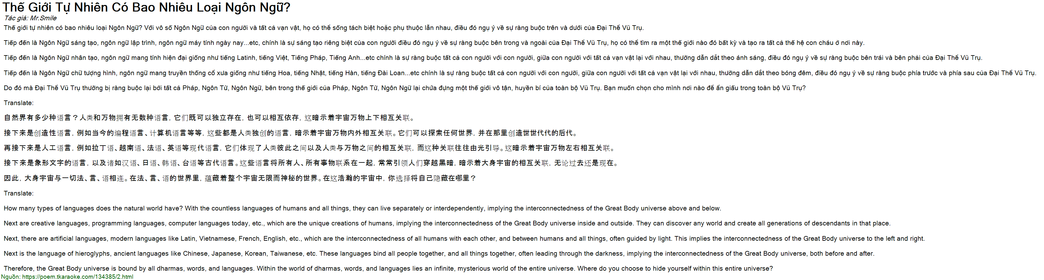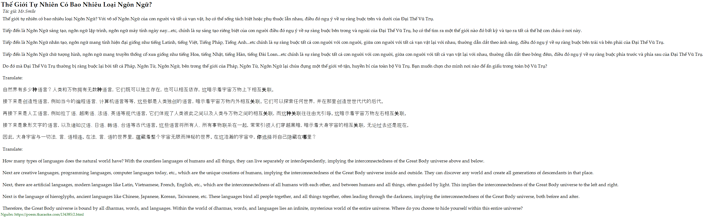 Thế giới tự nhiên có bao nhiêu loại Ngôn Ngữ? Với vô số Ngôn Ngữ của con người và tất cả vạn vật, họ có thể sống tách biệt hoặc phụ thuộc lẫn nhau, điều đó ngụ ý về sự ràng buộc trên và dưới của Đại Thể Vũ Trụ.