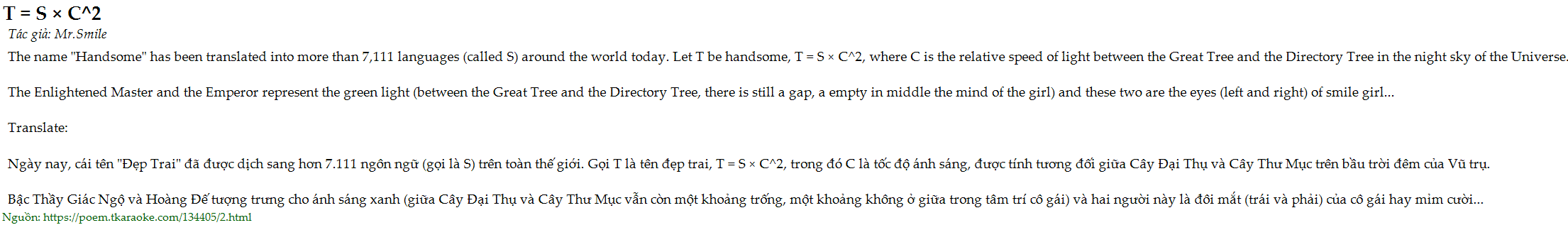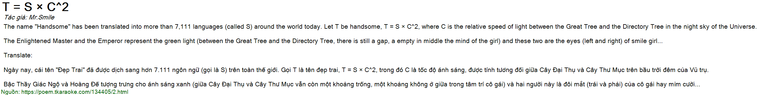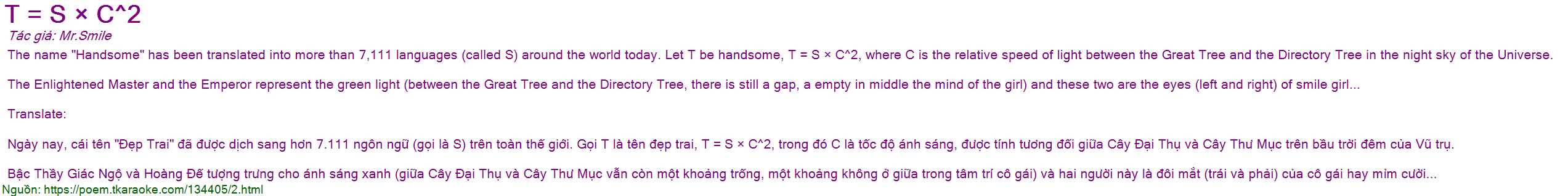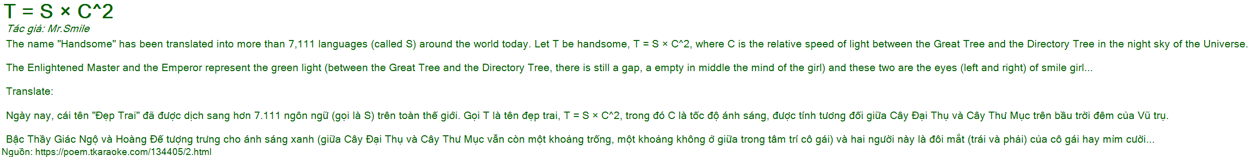 Ngày nay, cái tên "Đẹp Trai" đã được dịch sang hơn 7.111 ngôn ngữ (gọi là S) trên toàn thế giới. Gọi T là tên đẹp trai, T = S × C^2, trong đó C là tốc độ ánh sáng, được tính tương đối giữa Cây Đại Thụ và Cây Thư Mục trên bầu trời đêm của Vũ trụ.