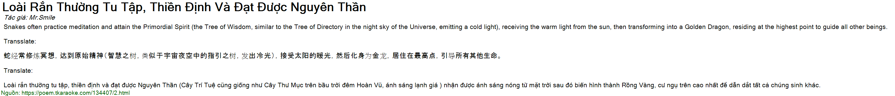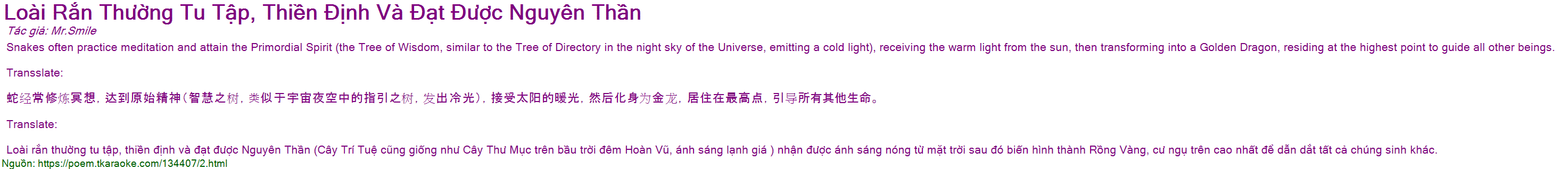 Loài rắn thường tu tập, thiền định và đạt được Nguyên Thần (Cây Trí Tuệ cũng giống như Cây Thư Mục trên bầu trời đêm Hoàn Vũ, ánh sáng lạnh giá ) nhận được ánh sáng nóng từ mặt trời sau đó biến hình thành Rồng Vàng, cư ngụ trên cao nhất để dẫn dắt tất cả chúng sinh khác.