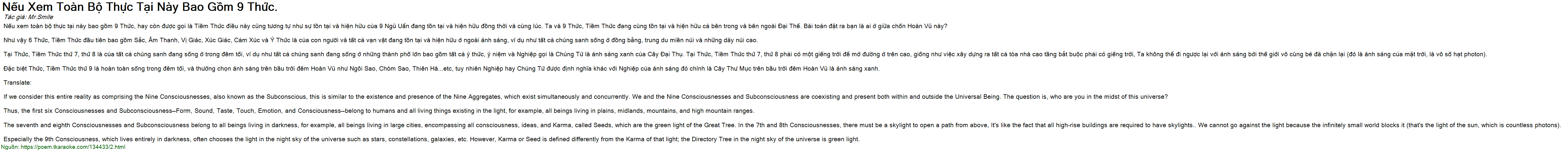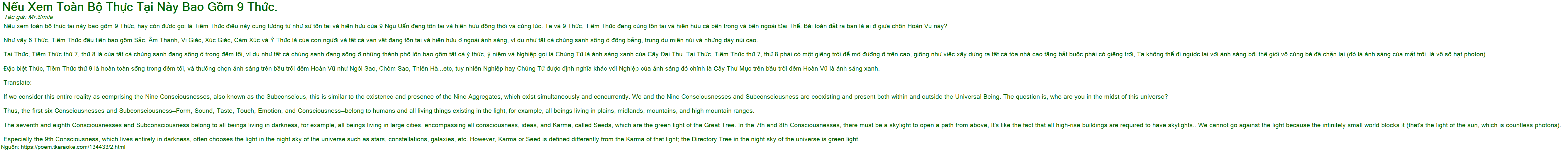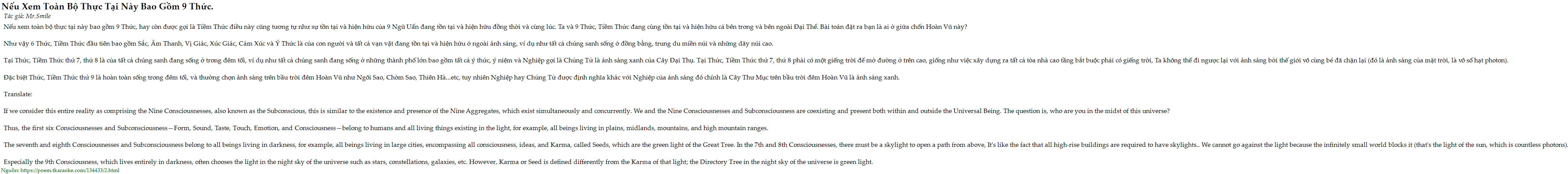 Nếu xem toàn bộ thực tại này bao gồm 9 Thức, hay còn được gọi là Tiềm Thức điều này cũng tương tự như sự tồn tại và hiện hữu của 9 Ngũ Uẩn đang tồn tại và hiện hữu đồng thời và cùng lúc. Ta và 9 Thức, Tiềm Thức đang cùng tồn tại và hiện hữu cả bên trong và bên ngoài Đại Thể. Bài toán đặt ra bạn là ai ở giữa chốn Hoàn Vũ này?