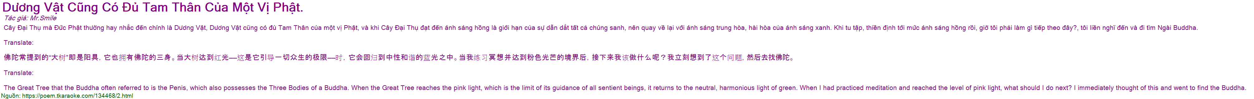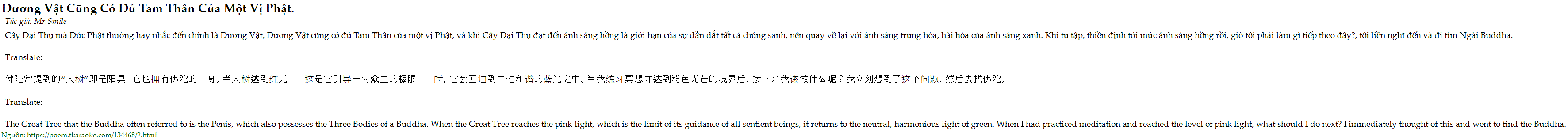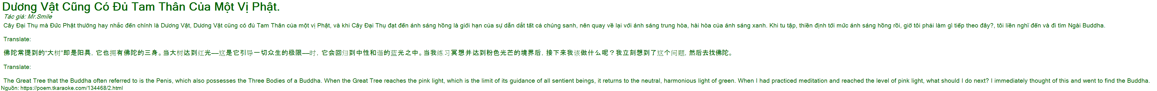 Cây Đại Thụ mà Đức Phật thường hay nhắc đến chính là Dương Vật, Dương Vật cũng có đủ Tam Thân của một vị Phật, và khi Cây Đại Thụ đạt đến ánh sáng hồng là giới hạn của sự dẫn dắt tất cả chúng sanh, nên quay về lại với ánh sáng trung hòa, hài hòa của ánh sáng xanh. Khi tu tập, thiền định tới mức ánh sáng hồng rồi, giờ tôi phải làm gì tiếp theo đây?, tôi liền nghĩ đến và đi tìm Ngài Buddha.