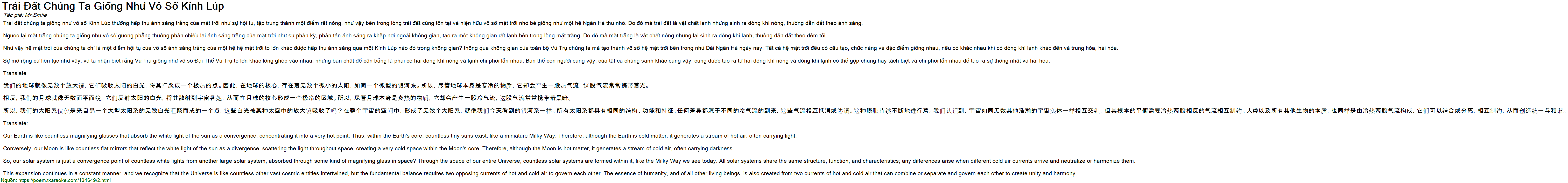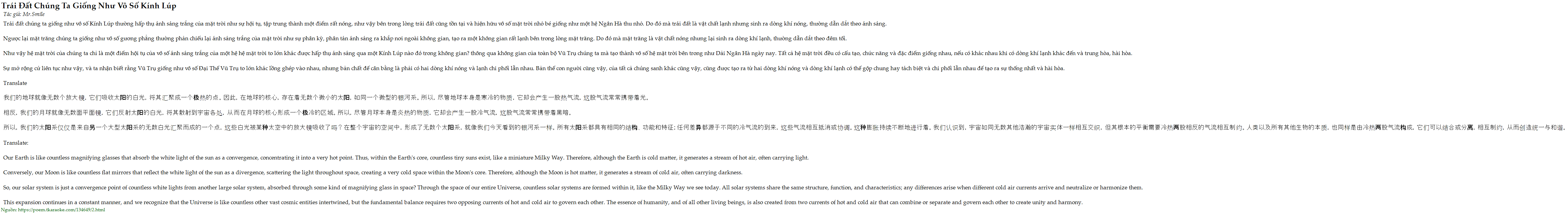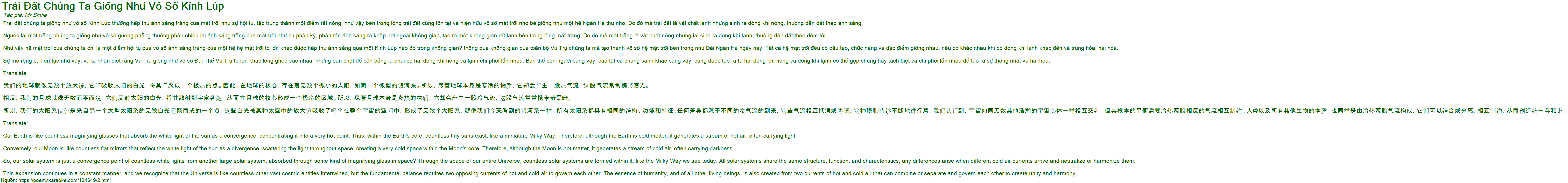 Trái đất chúng ta giống như vô số Kính Lúp thường hấp thụ ánh sáng trắng của mặt trời như sự hội tụ, tập trung thành một điểm rất nóng, như vậy bên trong lòng trái đất cũng tồn tại và hiện hữu vô số mặt trời nhỏ bé giống như một hệ Ngân Hà thu nhỏ. Do đó mà trái đất là vật chất lạnh nhưng sinh ra dòng khí nóng, thường dẫn dắt theo ánh sáng.