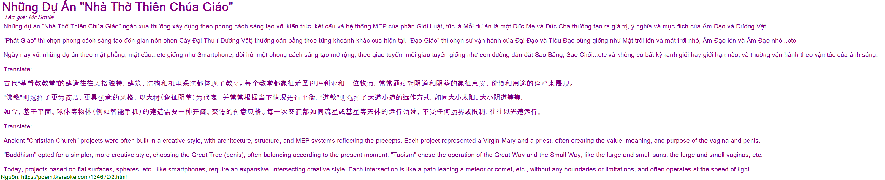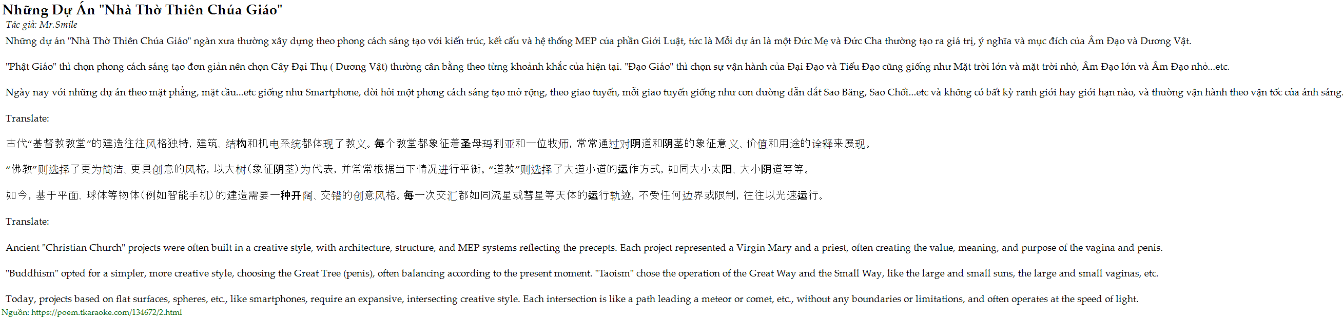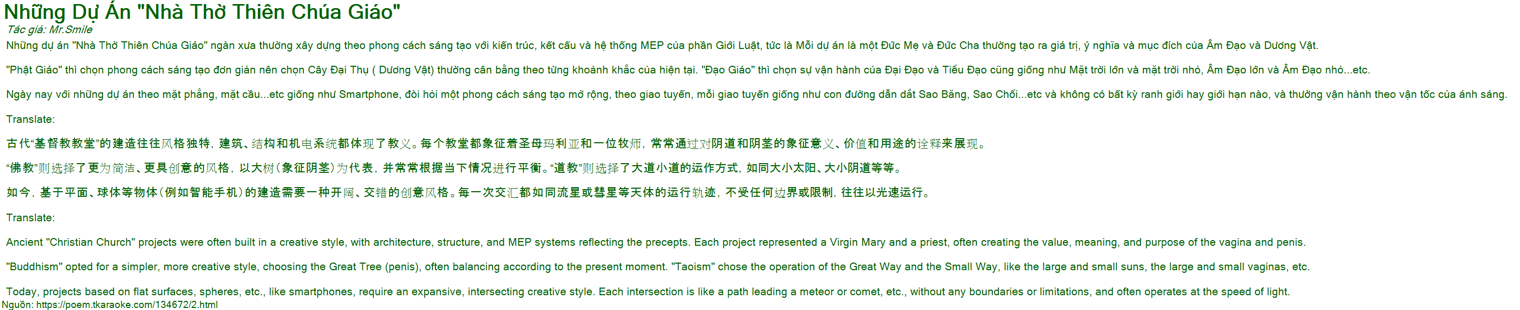 Những dự án "Nhà Thờ Thiên Chúa Giáo" ngàn xưa thường xây dựng theo phong cách sáng tạo với kiến trúc, kết cấu và hệ thống MEP của phần Giới Luật, tức là Mỗi dự án là một Đức Mẹ và Đức Cha thường tạo ra giá trị, ý nghĩa và mục đích của Âm Đạo và Dương Vật.