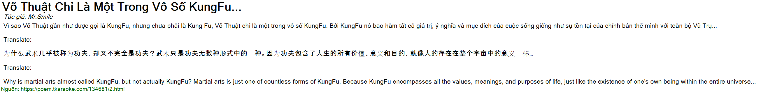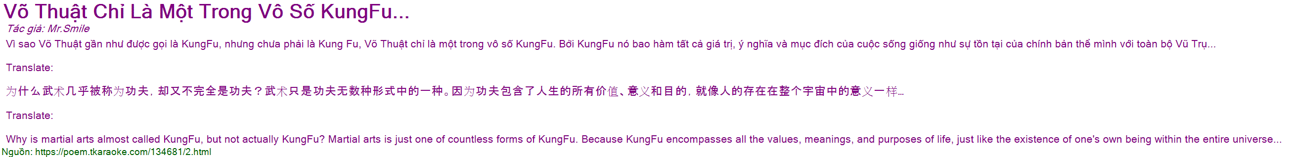 Vì sao Võ Thuật gần như được gọi là KungFu, nhưng chưa phải là Kung Fu, Võ Thuật chỉ là một trong vô số KungFu. Bởi KungFu nó bao hàm tất cả giá trị, ý nghĩa và mục đích của cuộc sống giống như sự tồn tại của chính bản thể mình với toàn bộ Vũ Trụ...