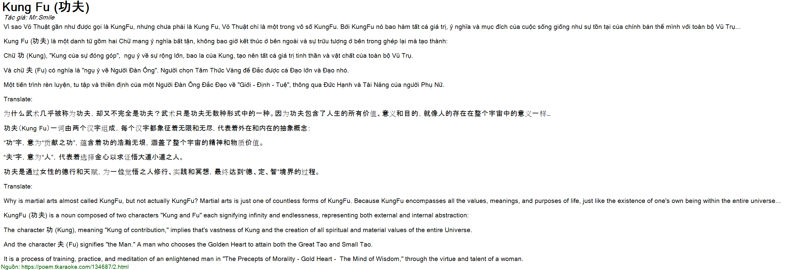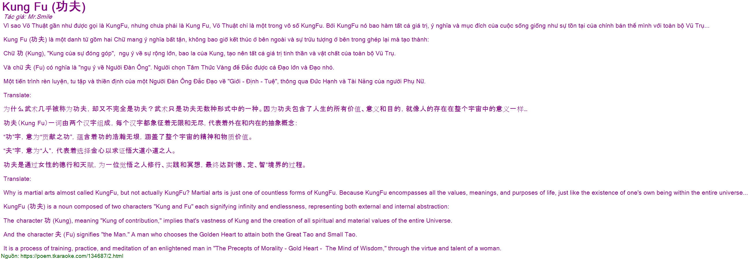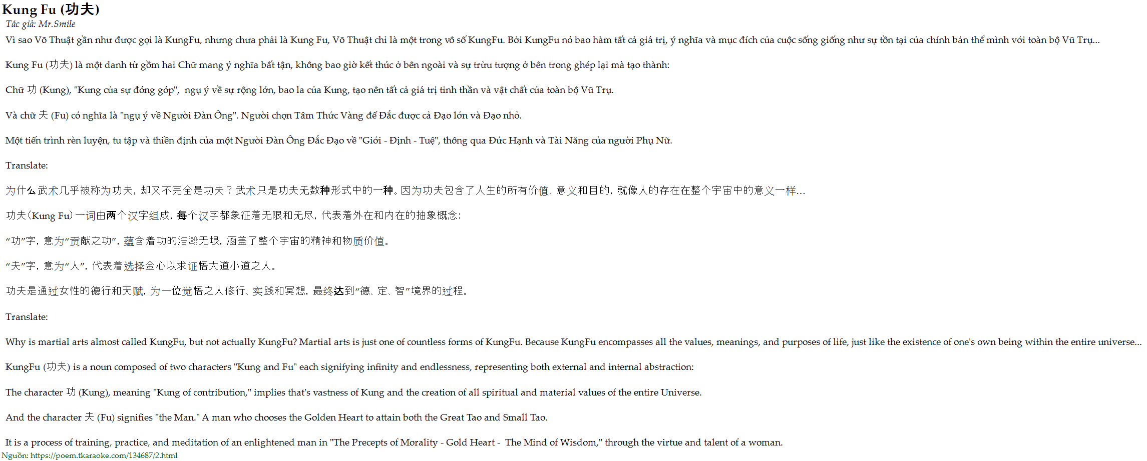 Vì sao Võ Thuật gần như được gọi là KungFu, nhưng chưa phải là Kung Fu, Võ Thuật chỉ là một trong vô số KungFu. Bởi KungFu nó bao hàm tất cả giá trị, ý nghĩa và mục đích của cuộc sống giống như sự tồn tại của chính bản thể mình với toàn bộ Vũ Trụ...