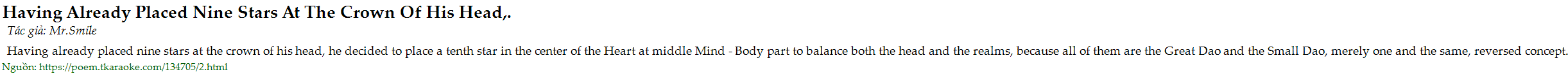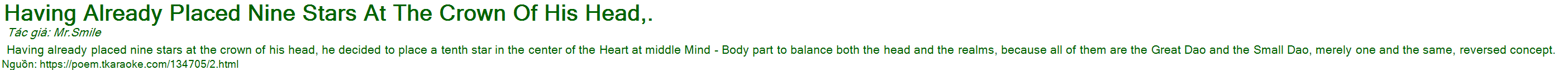 Having already placed nine stars at the crown of his head, he decided to place a tenth star in the center of the Heart at middle Mind - Body part to balance both the head and the realms, because all of them are the Great Dao and the Small Dao, merely one and the same, reversed concept.