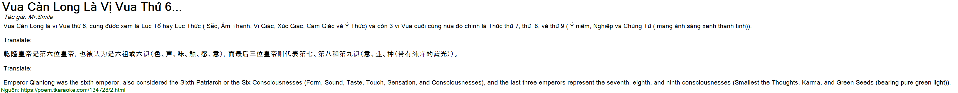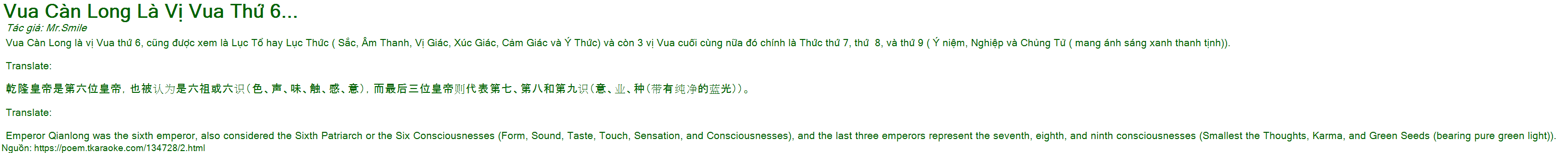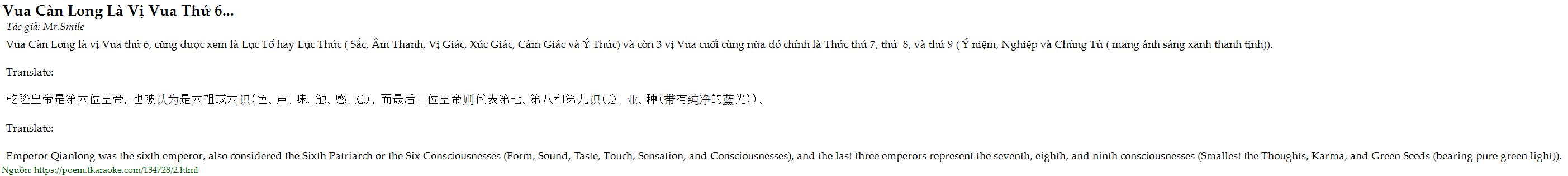 Vua Càn Long là vị Vua thứ 6, cũng được xem là Lục Tổ hay Lục Thức ( Sắc, Âm Thanh, Vị Giác, Xúc Giác, Cảm Giác và Ý Thức) và còn 3 vị Vua cuối cùng nữa đó chính là Thức thứ 7, thứ 8, và thứ 9 ( Ý niệm, Nghiệp và Chủng Tử ( mang ánh sáng xanh thanh tịnh)).