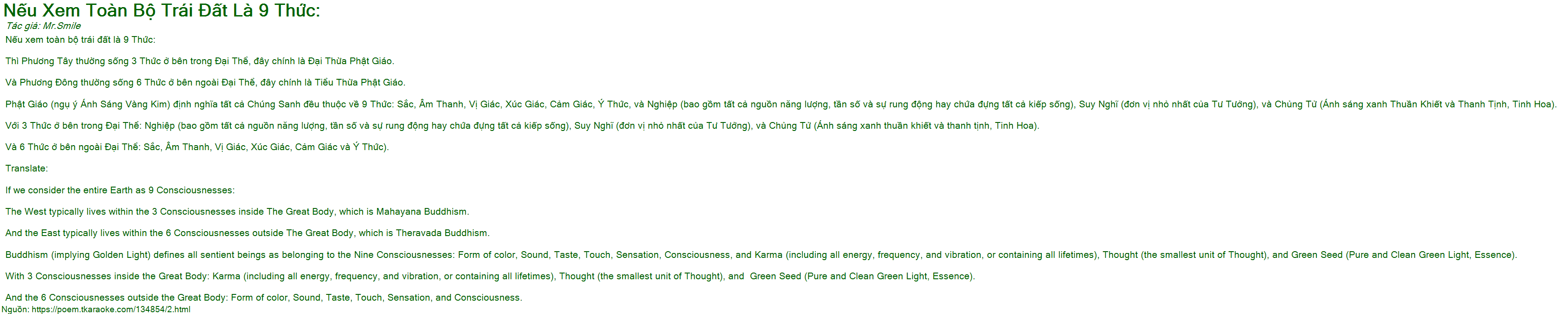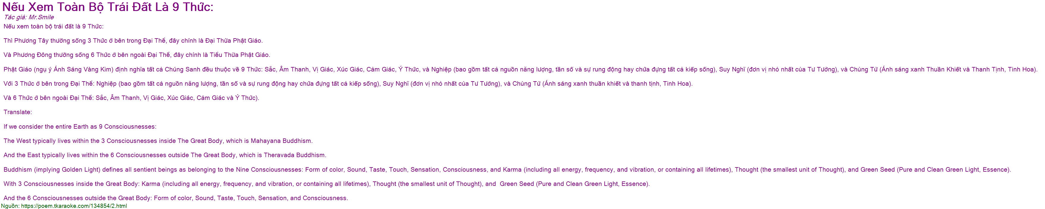 Và Phương Đông thường sống 6 Thức ở bên ngoài Đại Thể, đây chính là Tiểu Thừa Phật Giáo.