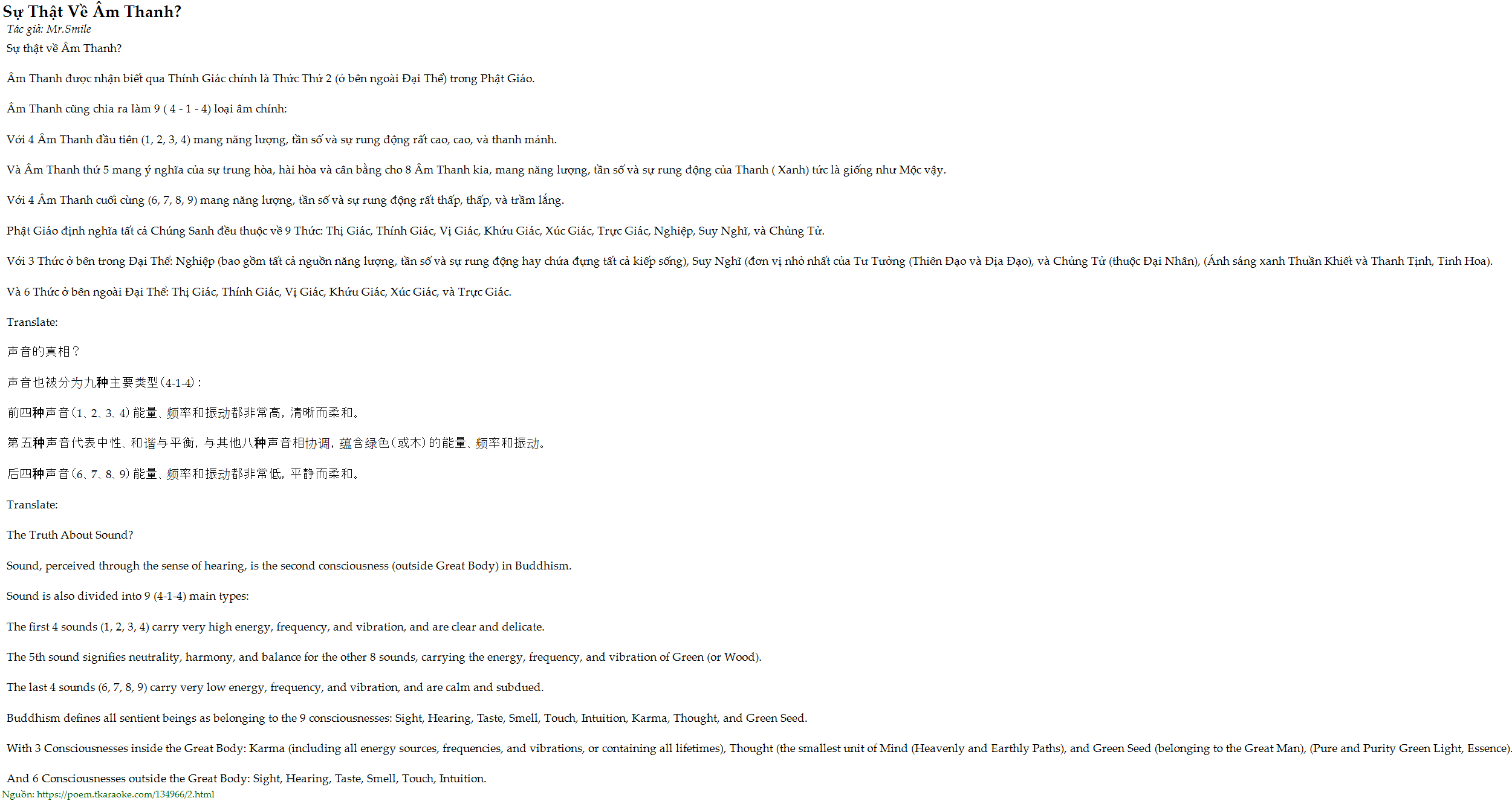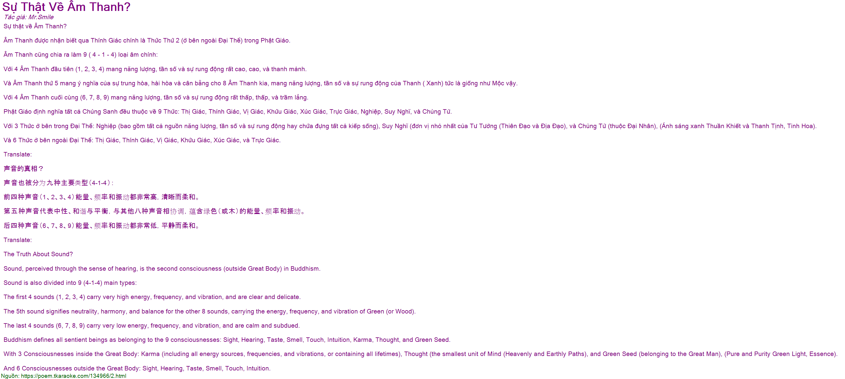 Âm Thanh được nhận biết qua Thính Giác chính là Thức Thứ 2 (ở bên ngoài Đại Thể) trong Phật Giáo.