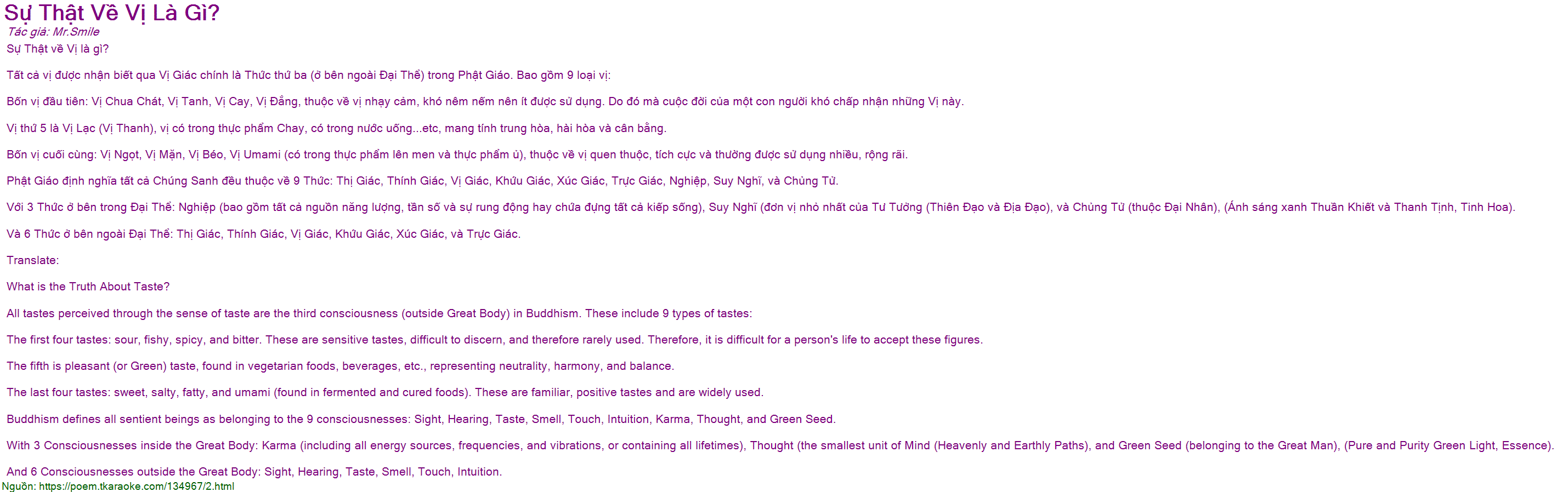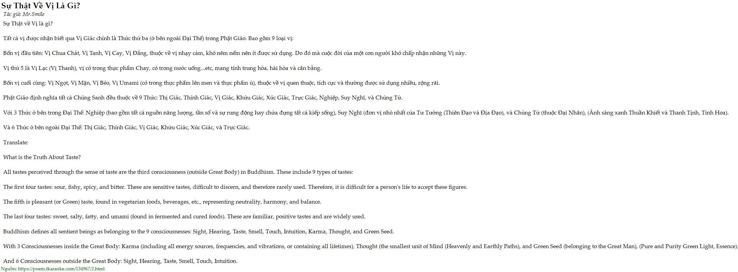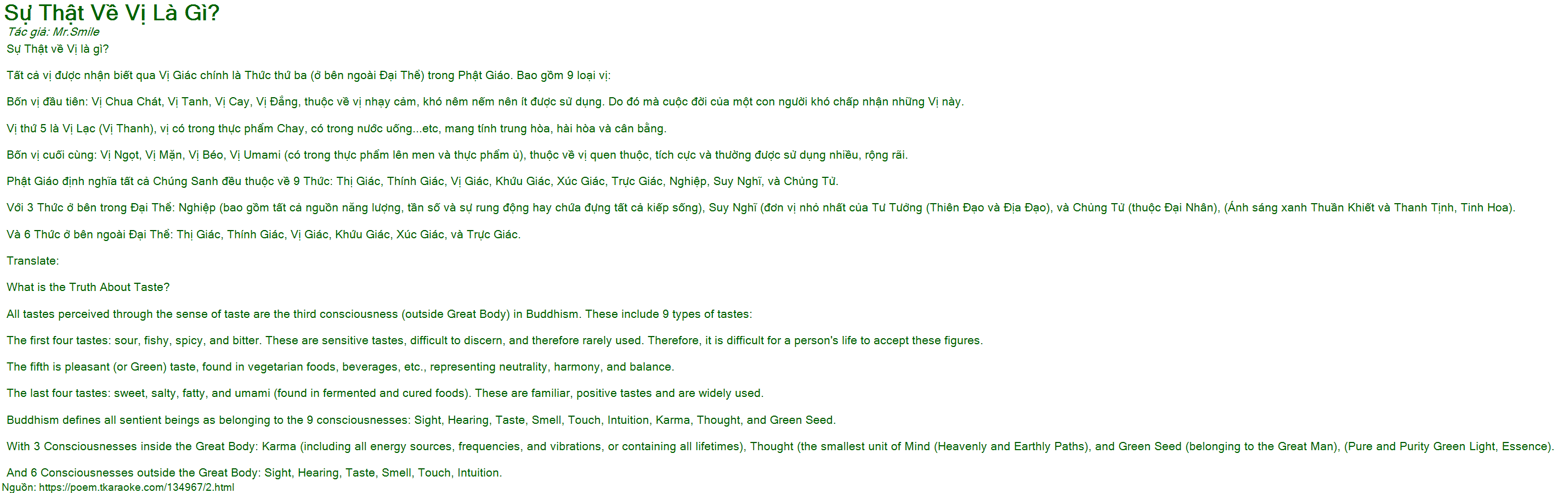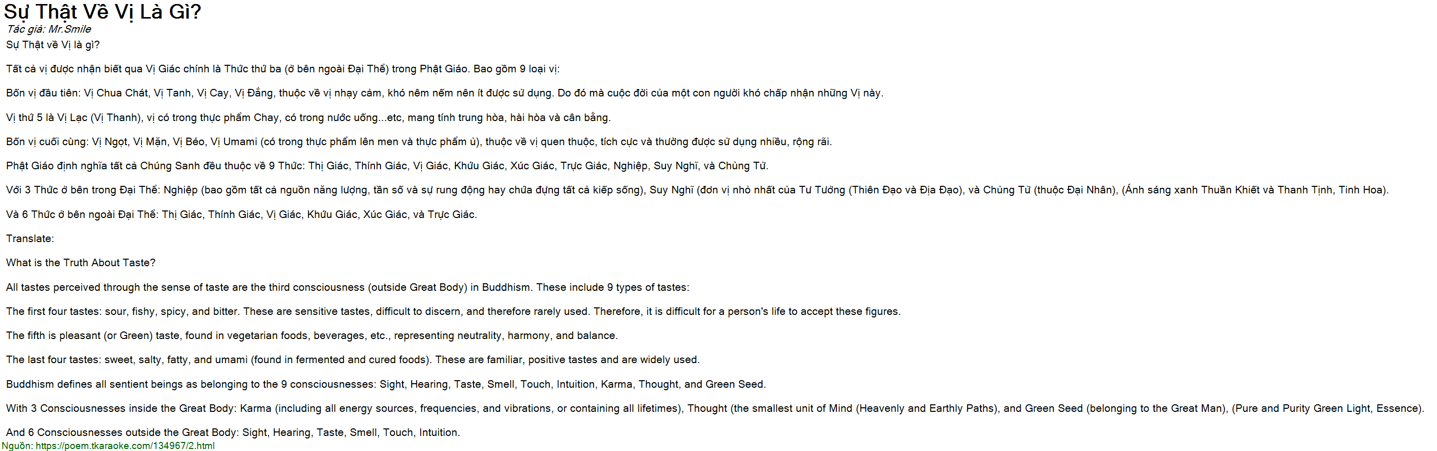 Tất cả vị được nhận biết qua Vị Giác chính là Thức thứ ba (ở bên ngoài Đại Thể) trong Phật Giáo. Bao gồm 9 loại vị: