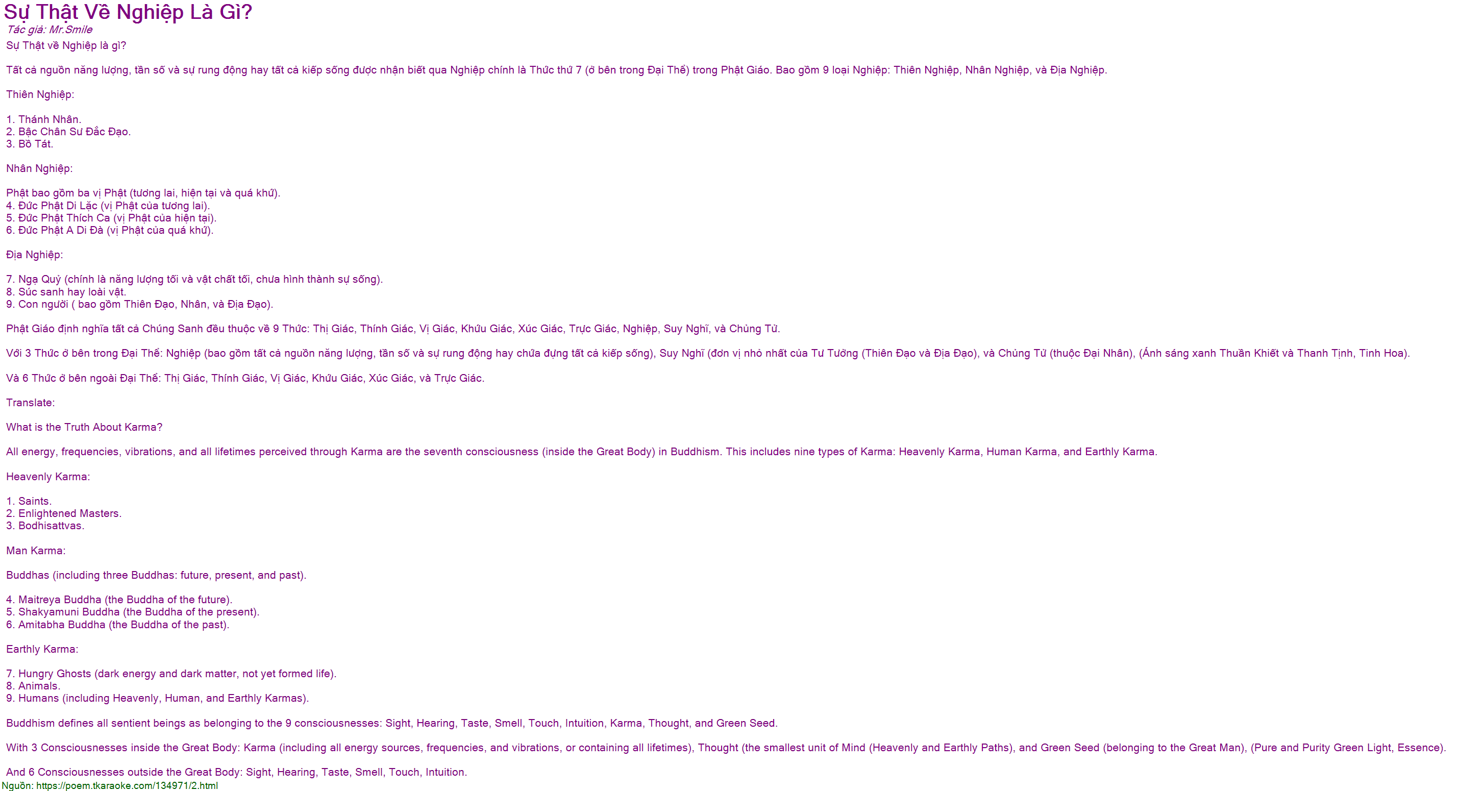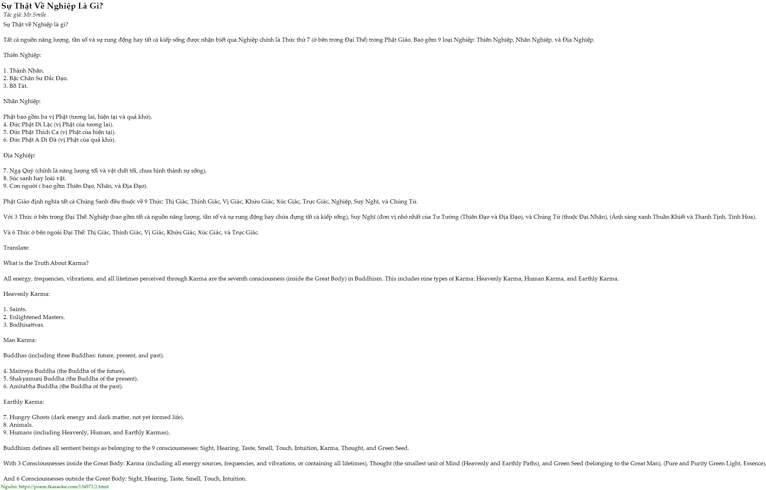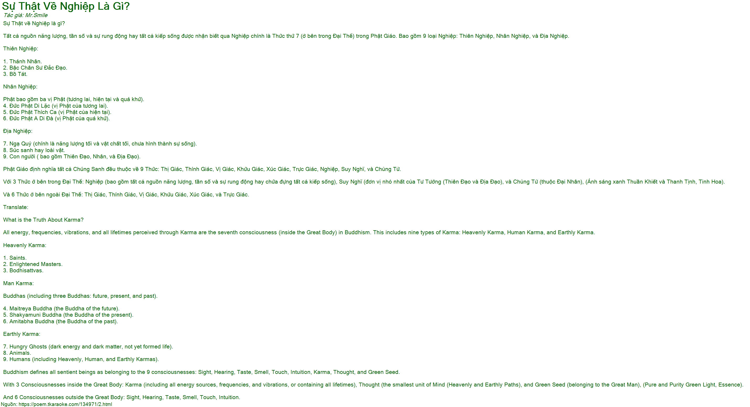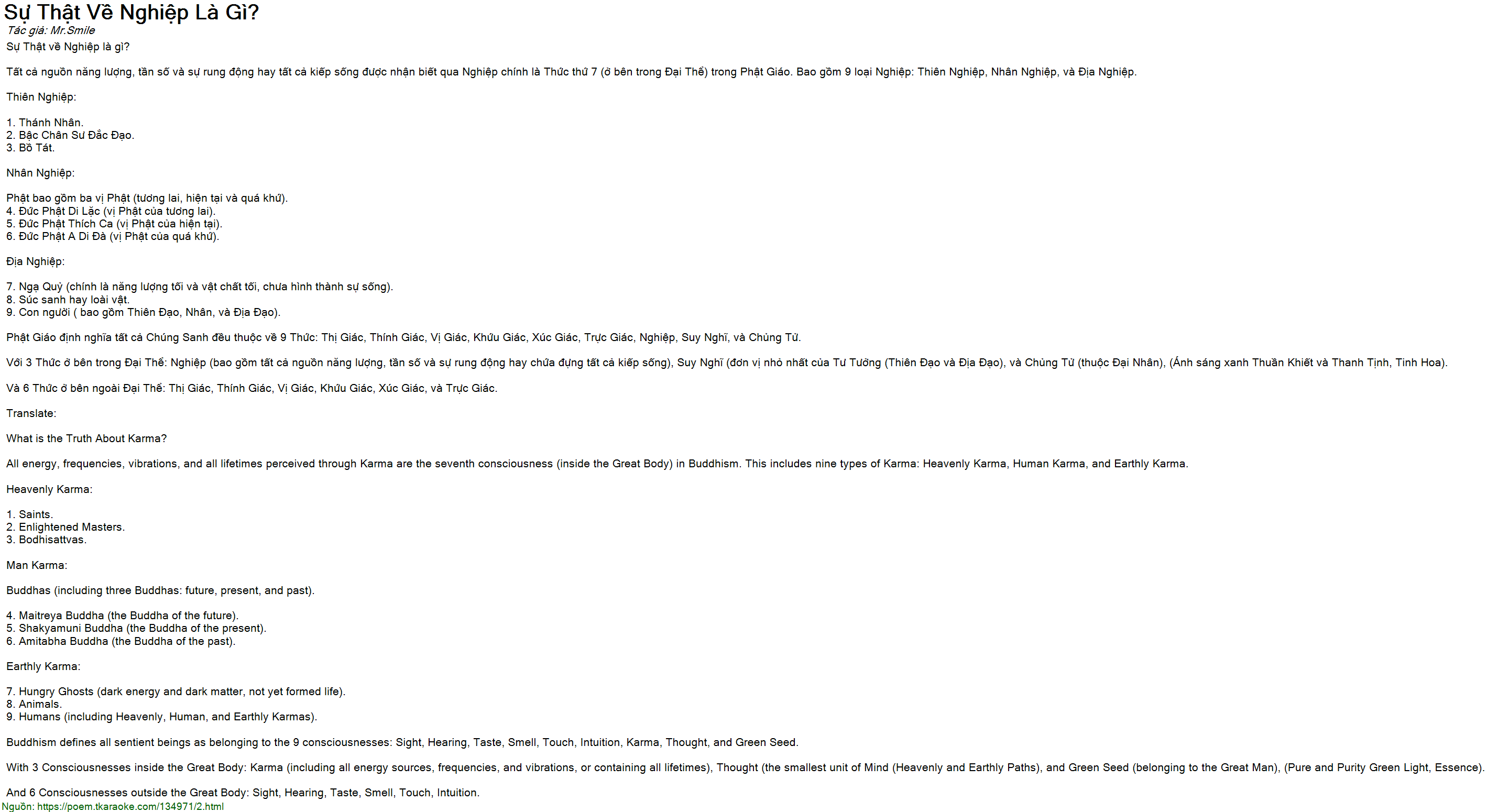 Tất cả nguồn năng lượng, tần số và sự rung động hay tất cả kiếp sống được nhận biết qua Nghiệp chính là Thức thứ 7 (ở bên trong Đại Thể) trong Phật Giáo. Bao gồm 9 loại Nghiệp: Thiên Nghiệp, Nhân Nghiệp, và Địa Nghiệp.