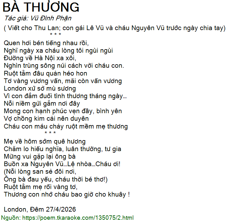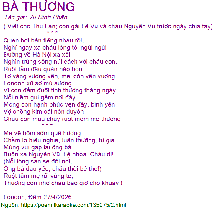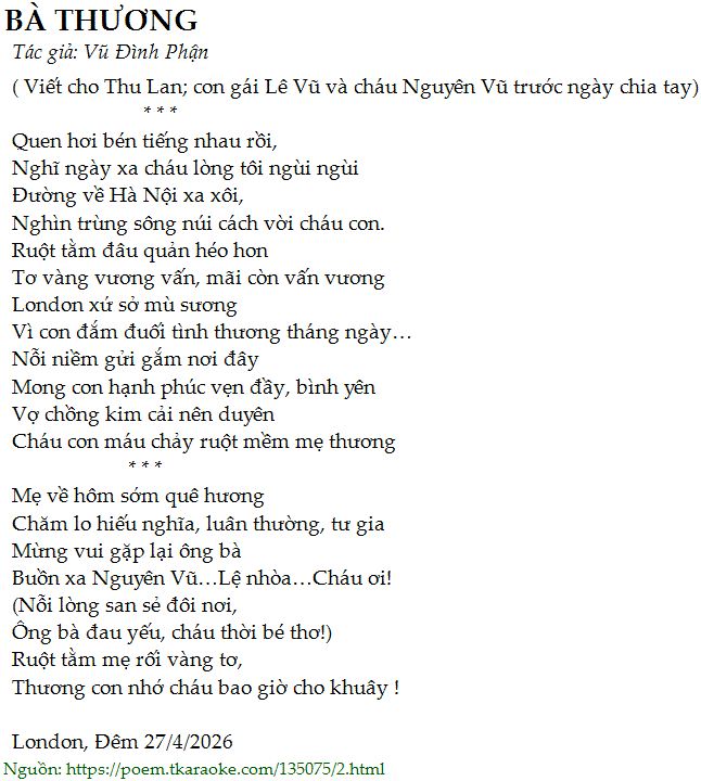 ( Viết cho Thu Lan; con gái Lê Vũ và cháu Nguyên Vũ trước ngày chia tay)