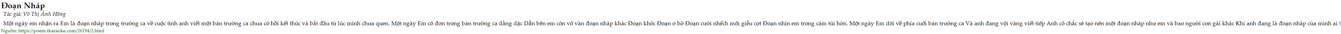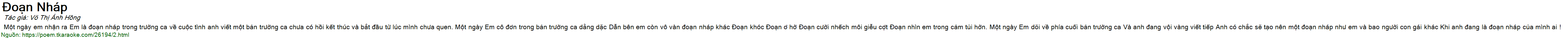 Một ngày em nhận ra Em là đoạn nháp trong trường ca về cuộc tình anh viết một bản trường ca chưa có hồi kết thúc và bắt đầu từ lúc mình chưa quen. Một ngày Em cô đơn trong bản trường ca dằng dặc Dẫn bên em còn vô vàn đoạn nháp khác Đoạn khóc Đoạn ơ hờ Đoạn cười nhếch môi giễu cợt Đoạn nhìn em trong cảm tủi hờn. Một ngày Em dõi về phía cuối bản trường ca Và anh đang vội vàng viết tiếp Anh có chắc sẽ tạo nên một đoạn nháp như em và bao người con gái khác Khi anh đang là đoạn nháp của mình ai !
